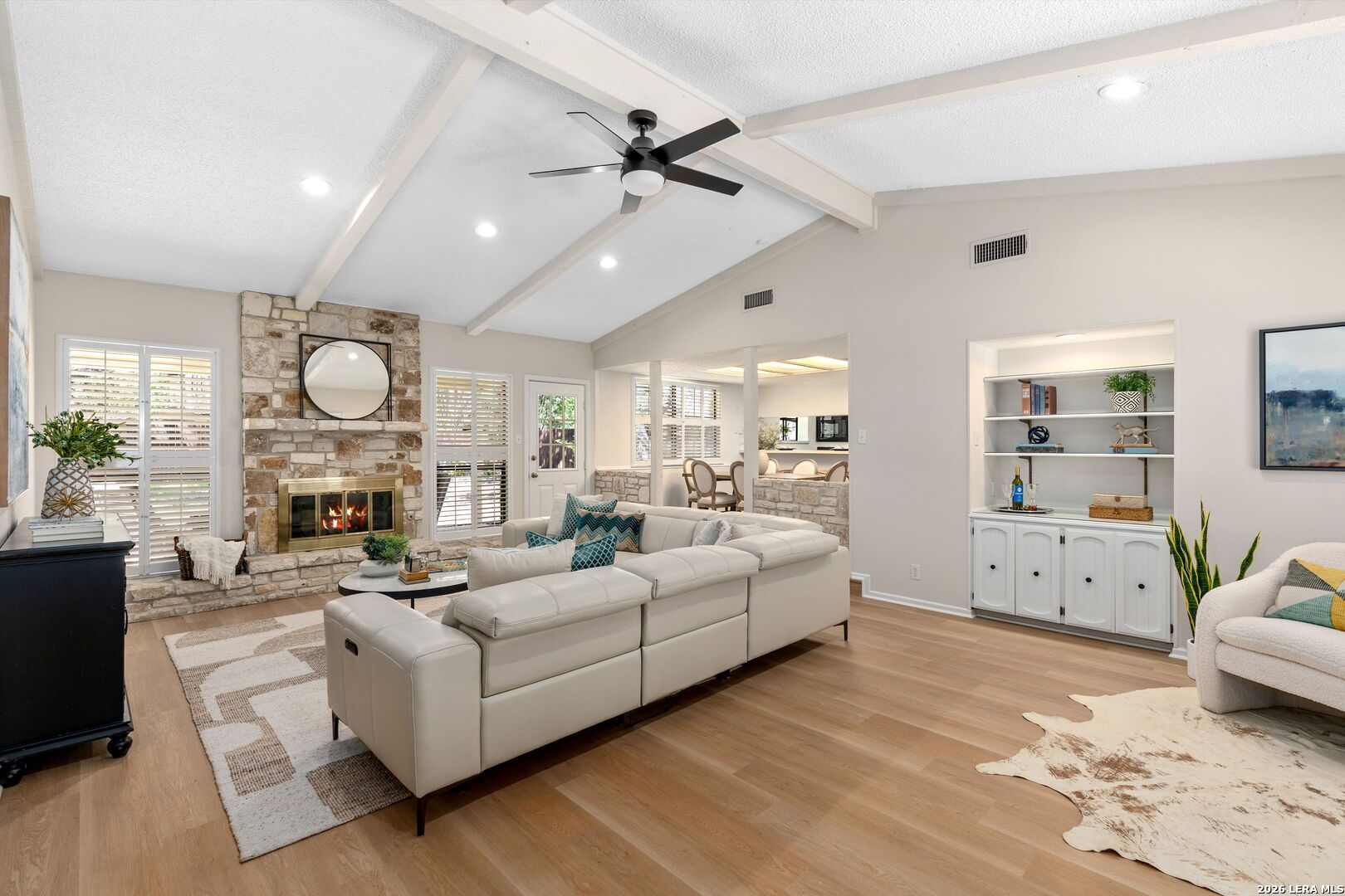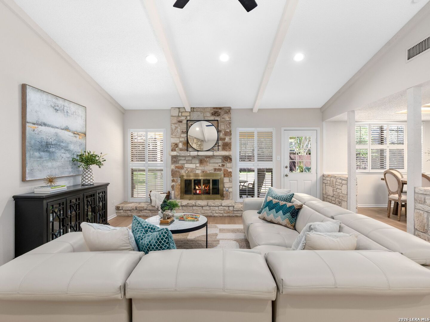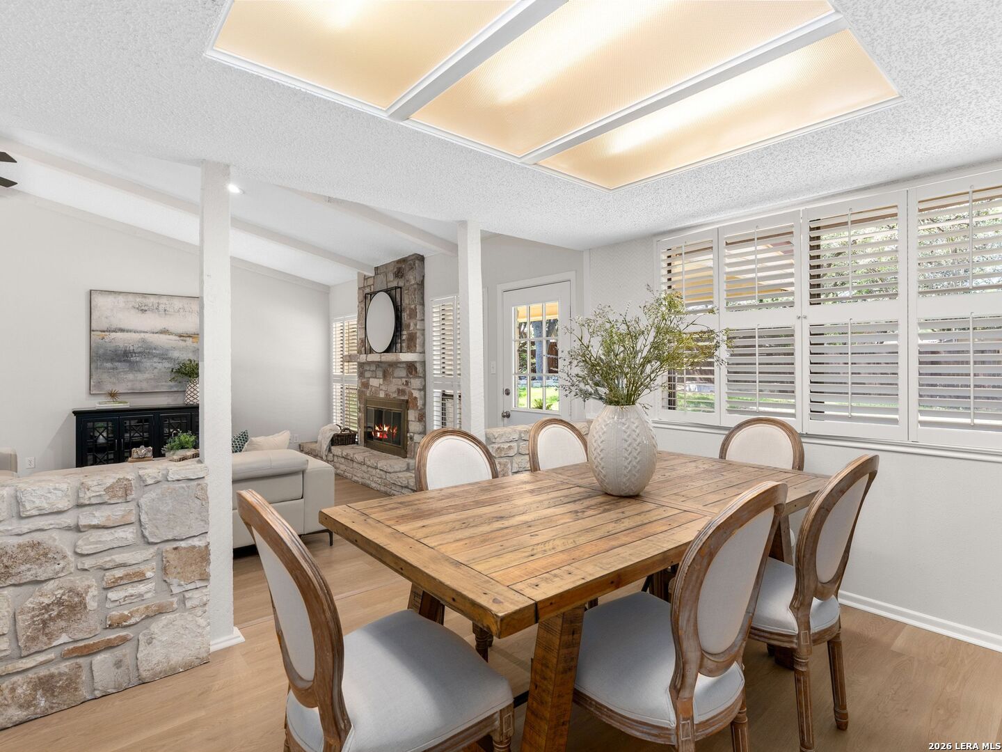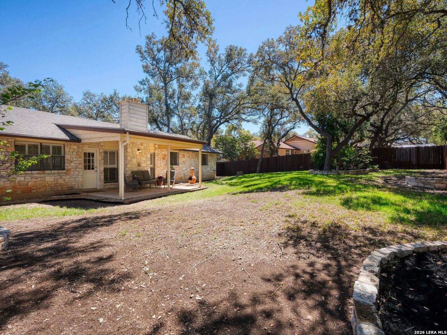 OPEN HOUSE- SUNDAY March 29th: 2pm-4 pm. Welcome to this stunning single-story home in the highly sought-after Braun Station community! Nestled on an oversized lot shaded by majestic mature oak trees, this beautifully updated property offers a rare blend of comfort, style, and a peaceful, country-like setting. Step inside to an inviting open-concept layout featuring vaulted ceilings, abundant natural light, and a spacious living room anchored by a striking stone fireplace. The home has been tastefully remodeled with luxury vinyl flooring, fresh interior paint, and modern light fixtures, creating a warm yet contemporary feel throughout. Plantation shutters add timeless elegance and function. The primary suite serves as a private retreat with a cozy sitting area, perfect for relaxing at the end of the day. Outdoors, enjoy fresh landscaping with partial xeriscaping, stone beds, and a covered patio ideal for entertaining or unwinding under the canopy of beautiful oak trees. Residents of Braun Station enjoy fantastic neighborhood amenities including a pool, tennis courts, clubhouse, playground, and sports court. Conveniently located near the Medical Center, it offers easy access to shopping, dining, and entertainment at La Cantera, as well as nearby attractions like SeaWorld and Six Flags Fiesta Texas. This home truly offers the perfect combination of charm, updates, location, and lifestyle.