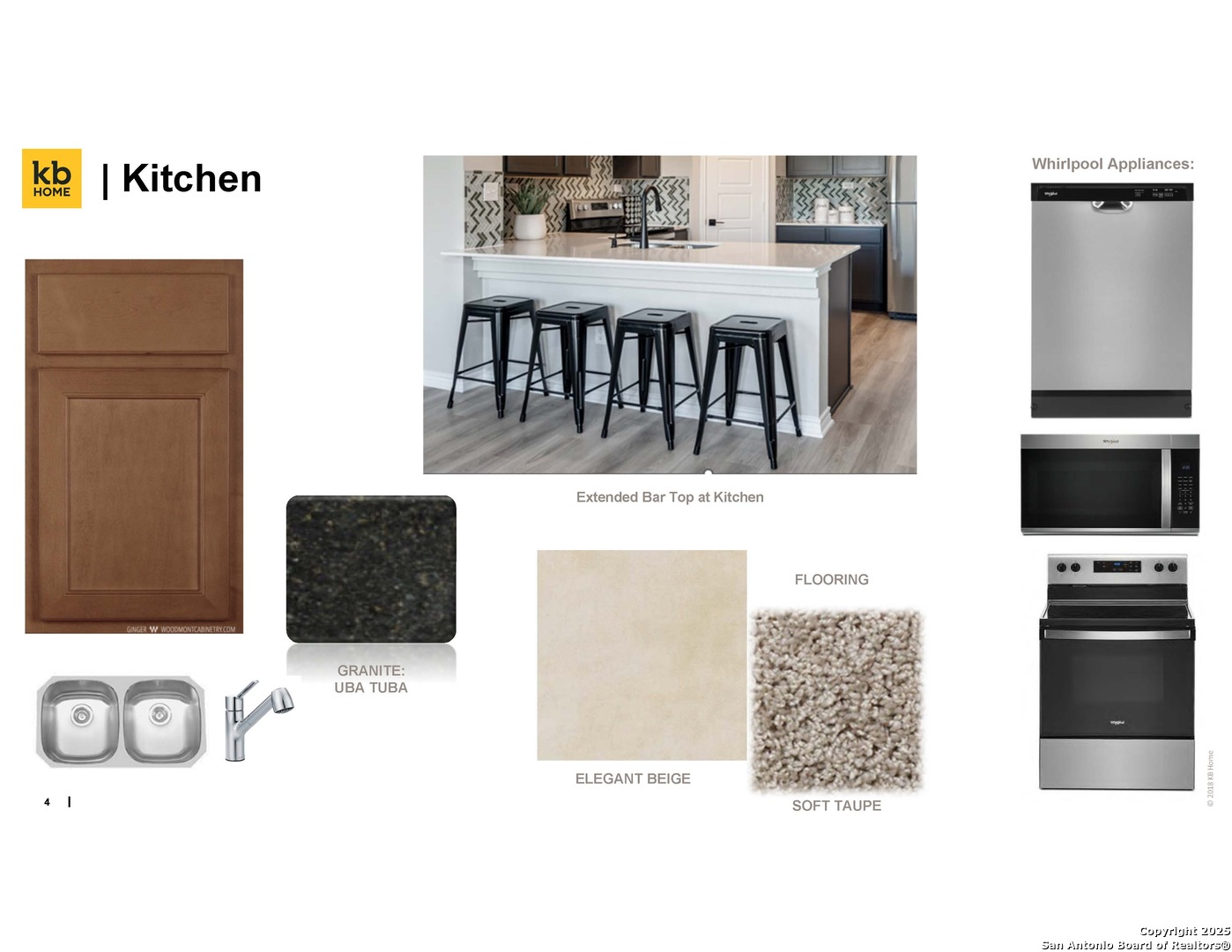 This beautifully designed home offers 9-ft. first floor ceilings and a versatile den with double doors, perfect for a home office or study. The kitchen features Whirlpool stainless steel appliances, Woodmont Cody 42-in. upper cabinets, granite countertops in Uba Tuba, and an extended breakfast bar for casual dining. The primary bath includes upgraded cabinets and a 42-in. shower with a sleek Daltile tile surround. Elegant details such as a Carrara-style entry door, Kwikset Polo knob hardware, and Peretuo ceramic tile flooring in the bathrooms, kitchen, and great room add a refined touch. Enjoy added security with a wireless system and outdoor ease with a fully sodded yard and automatic sprinkler system.