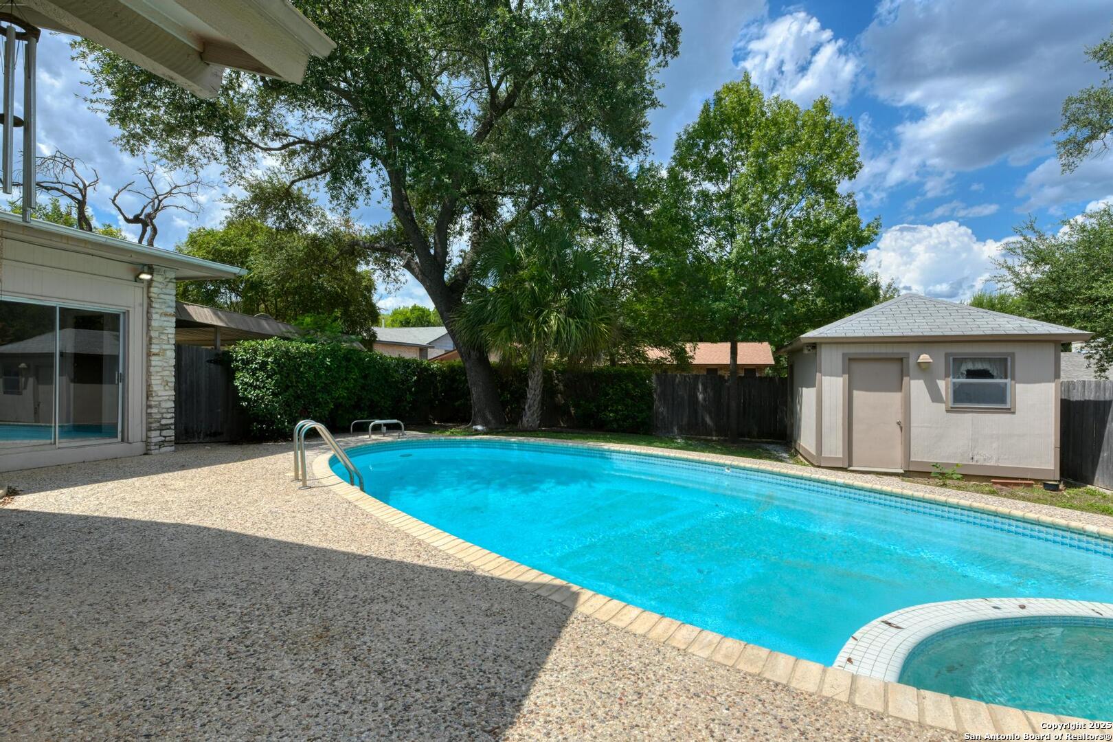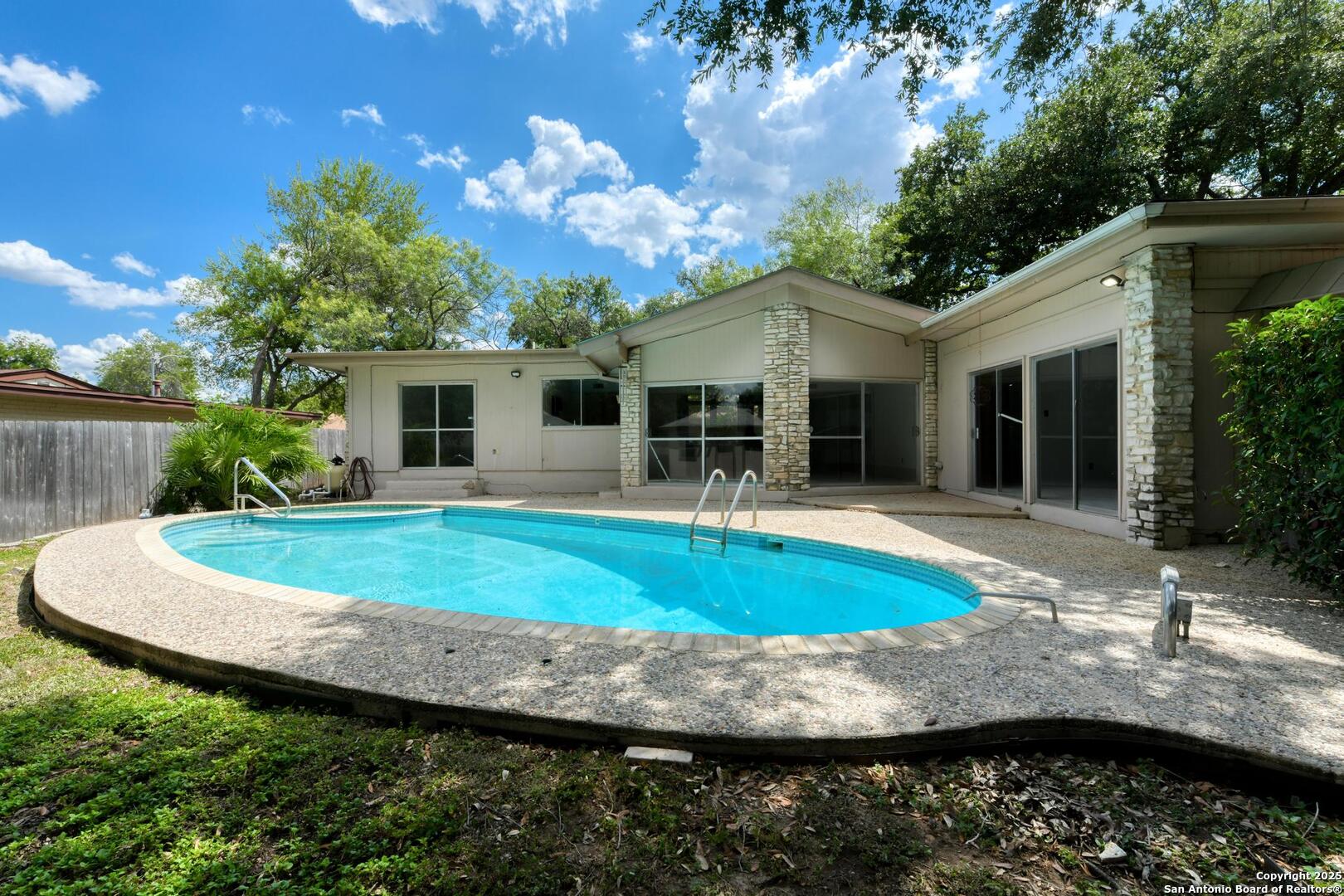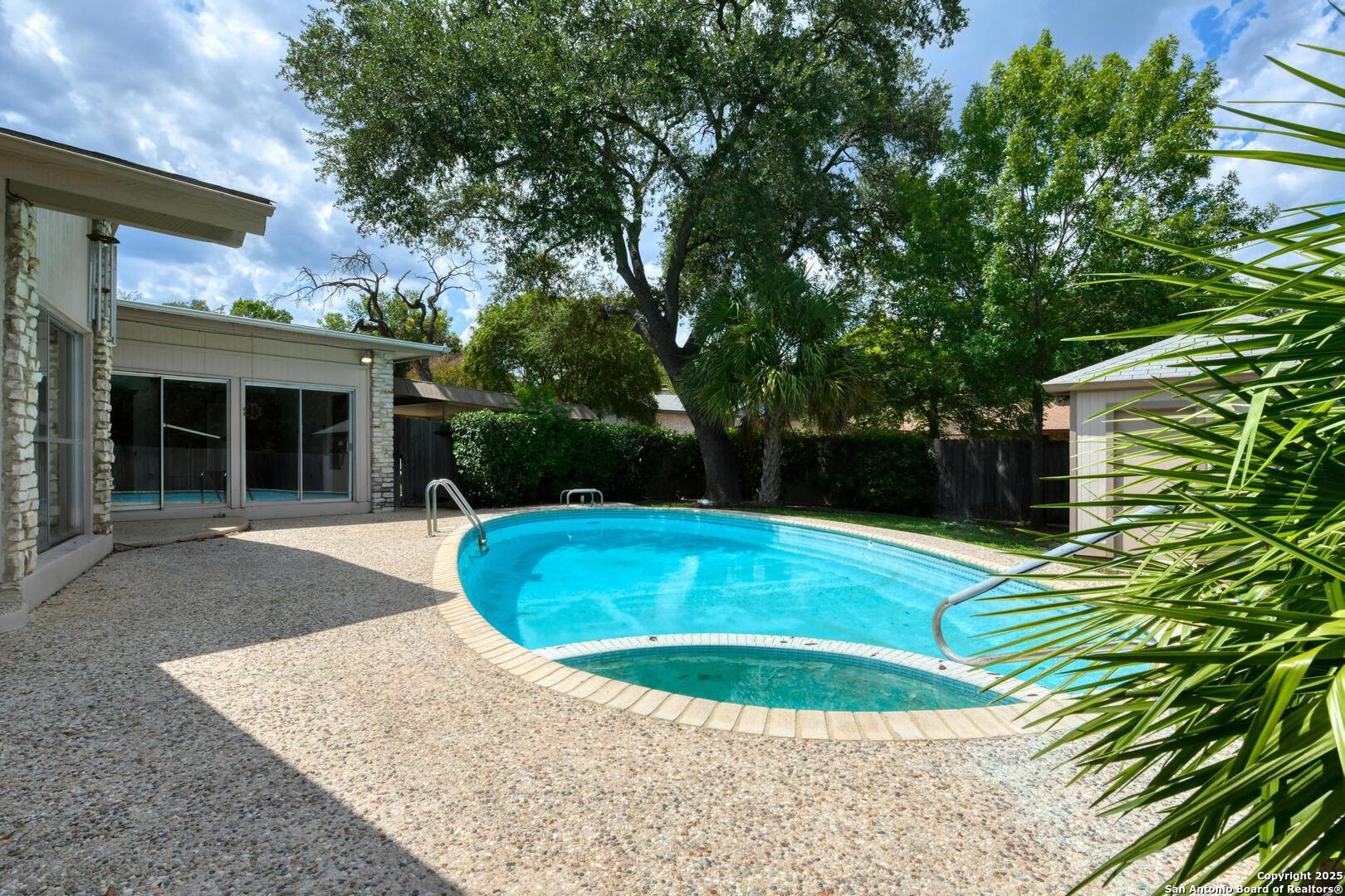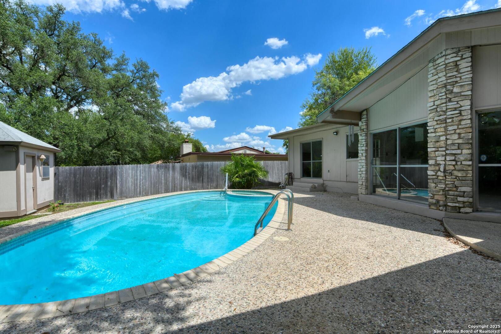 This single-story home with a rock exterior, siding accents, and mature trees offers wonderful curb appeal. Inside, you'll find 4 bedrooms and 3 baths in a layout designed for both comfort and entertaining. The sunken living room showcases vaulted ceilings, transom windows, and a bright, airy feel, complete with a cozy dry bar. A unique round rock wood-burning fireplace with a wide hearth adds charm and creates a perfect gathering spot. Fresh paint and recently installed carpet make the home move-in ready. The kitchen features a breakfast bar, smooth cooktop, built-in microwave, two built-in ovens, ample storage, and a large picture window that fills the space with natural light. The converted garage provides a versatile 4th bedroom with sliding glass doors, additional storage, and enough space for a refrigerator. Multiple sliding glass doors - from the living room, 4th bedroom, and primary suite - open to the sparkling in-ground pool, blending indoor and outdoor living. The primary suite includes direct pool access, a sunken shower, and generous vanity storage. Outdoors, enjoy the pool and a storage shed for your tools or pool equipment. With flexible spaces, modern updates, and plenty of room to gather, this property is perfect for everyday living and entertaining alike.