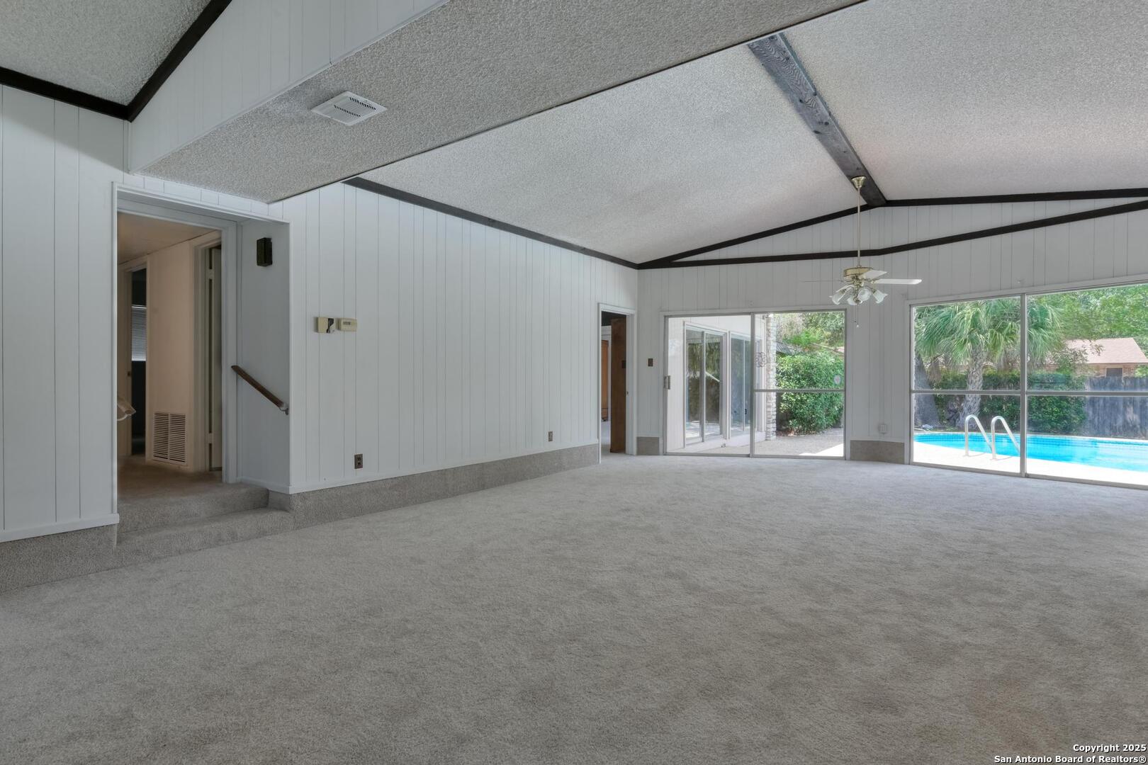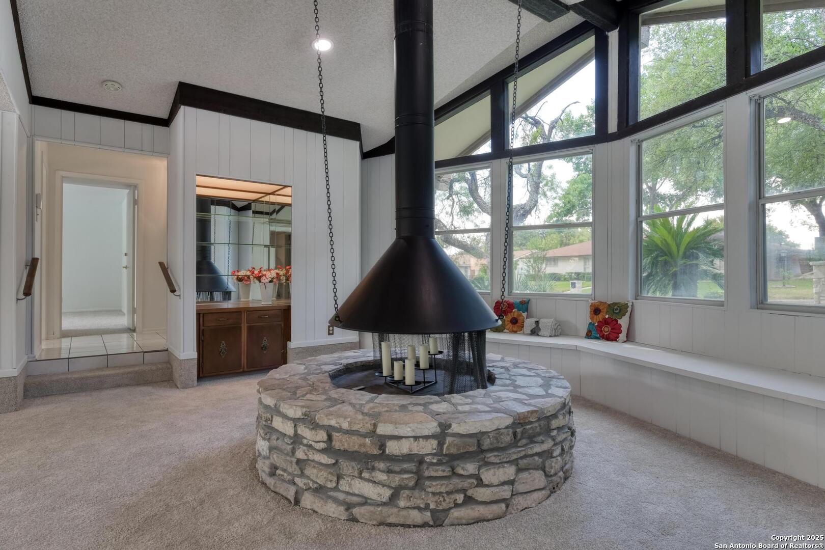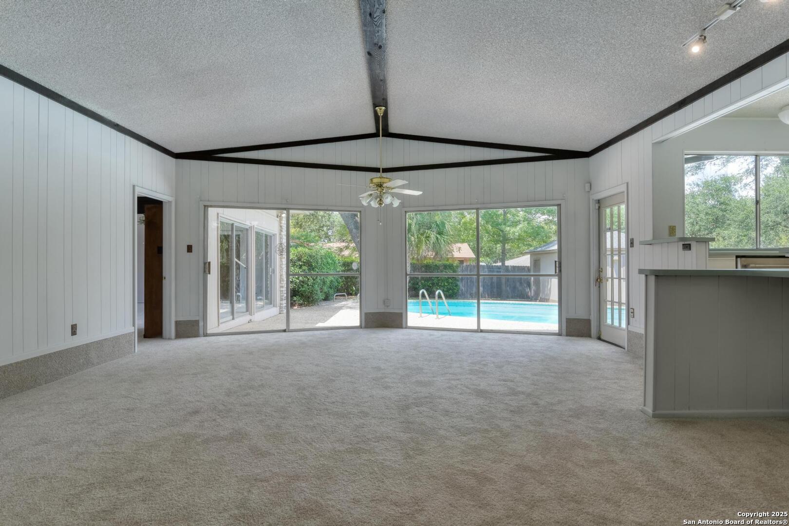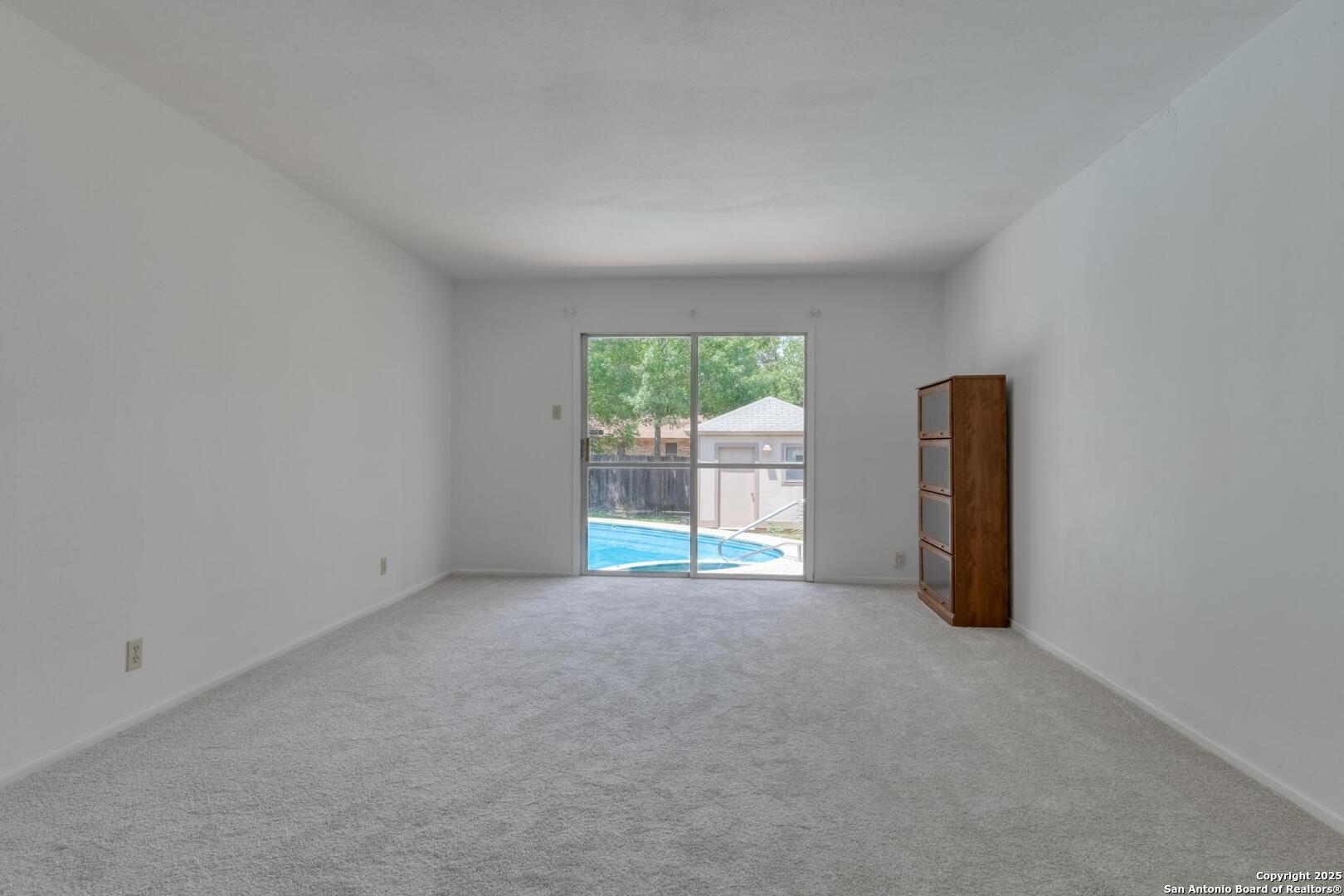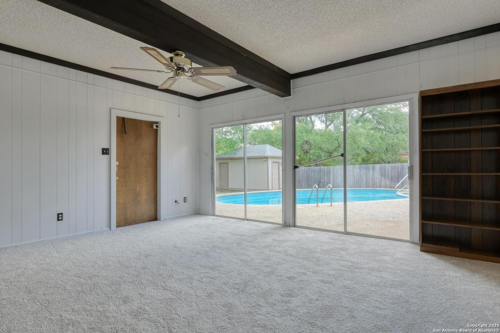 This single-story home with a rock exterior, siding accents, and mature trees offers wonderful curb appeal. Inside, you'll find 4 bedrooms and 3 baths in a layout designed for both comfort and entertaining. The sunken living room showcases vaulted ceilings, transom windows, and a bright, airy feel, complete with a cozy dry bar. A unique round rock wood-burning fireplace with a wide hearth adds charm and creates a perfect gathering spot. Fresh paint and recently installed carpet make the home move-in ready. The kitchen features a breakfast bar, smooth cooktop, built-in microwave, two built-in ovens, ample storage, and a large picture window that fills the space with natural light. The converted garage provides a versatile 4th bedroom with sliding glass doors, additional storage, and enough space for a refrigerator. Multiple sliding glass doors - from the living room, 4th bedroom, and primary suite - open to the sparkling in-ground pool, blending indoor and outdoor living. The primary suite includes direct pool access, a sunken shower, and generous vanity storage. Outdoors, enjoy the pool and a storage shed for your tools or pool equipment. With flexible spaces, modern updates, and plenty of room to gather, this property is perfect for everyday living and entertaining alike.