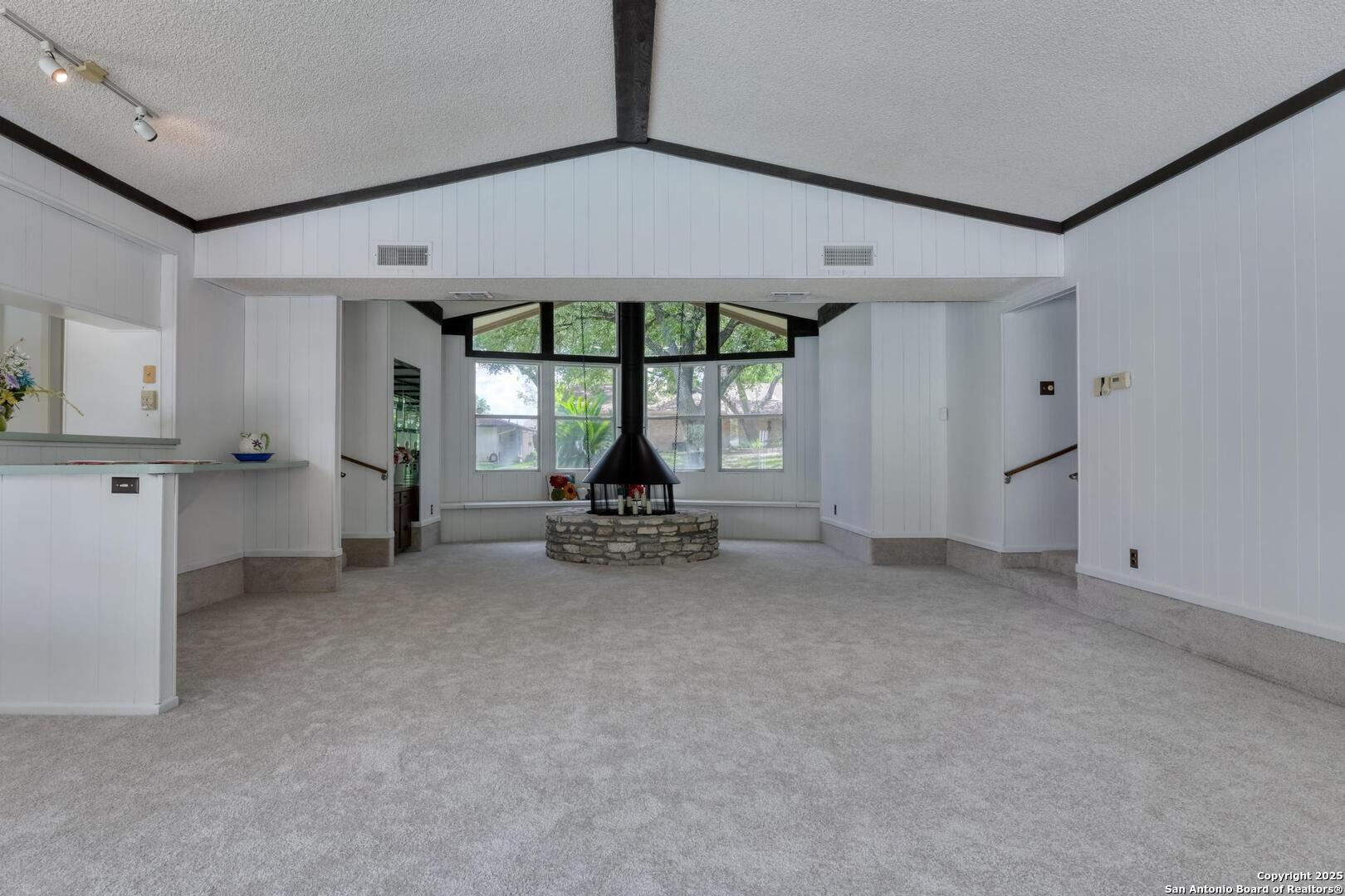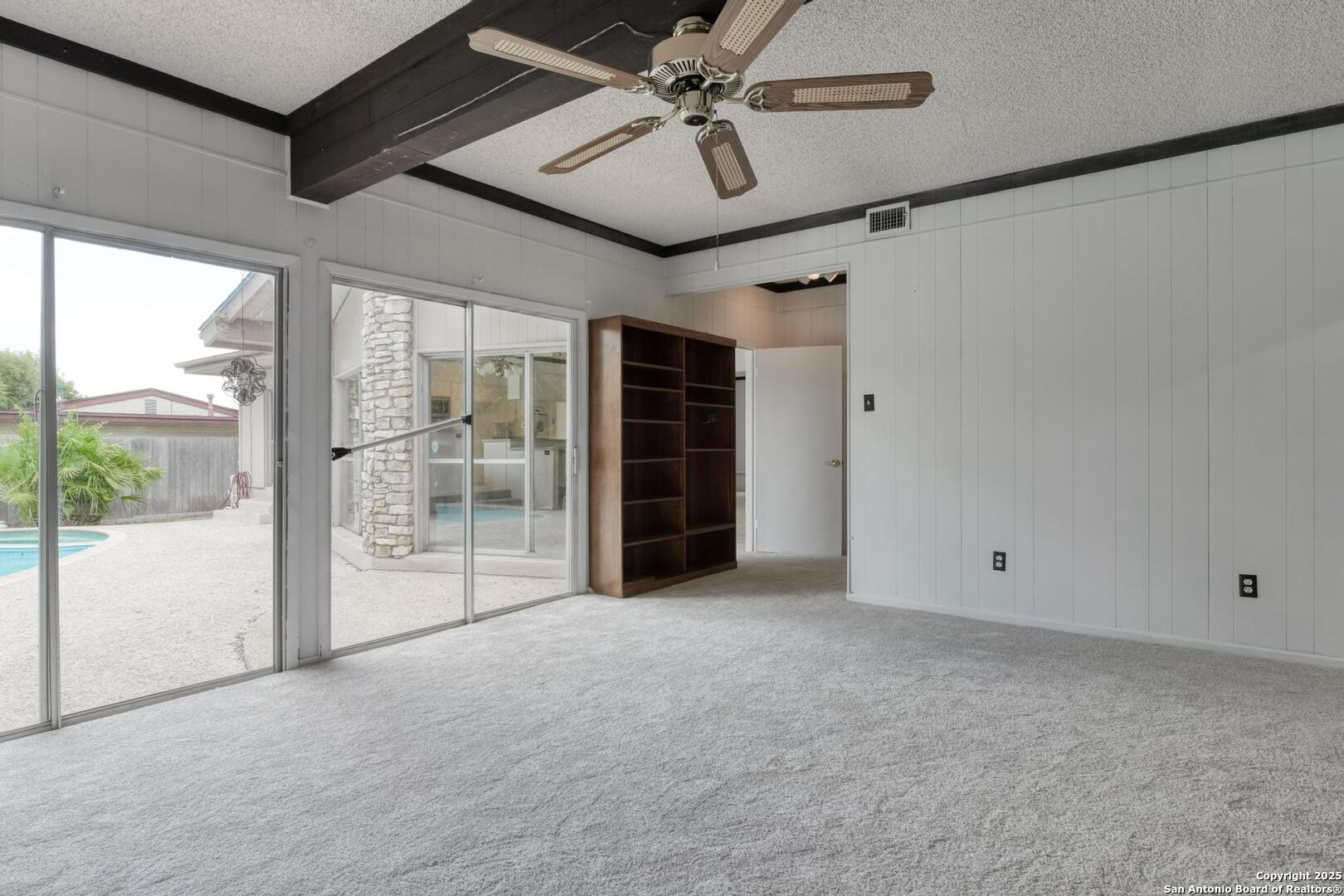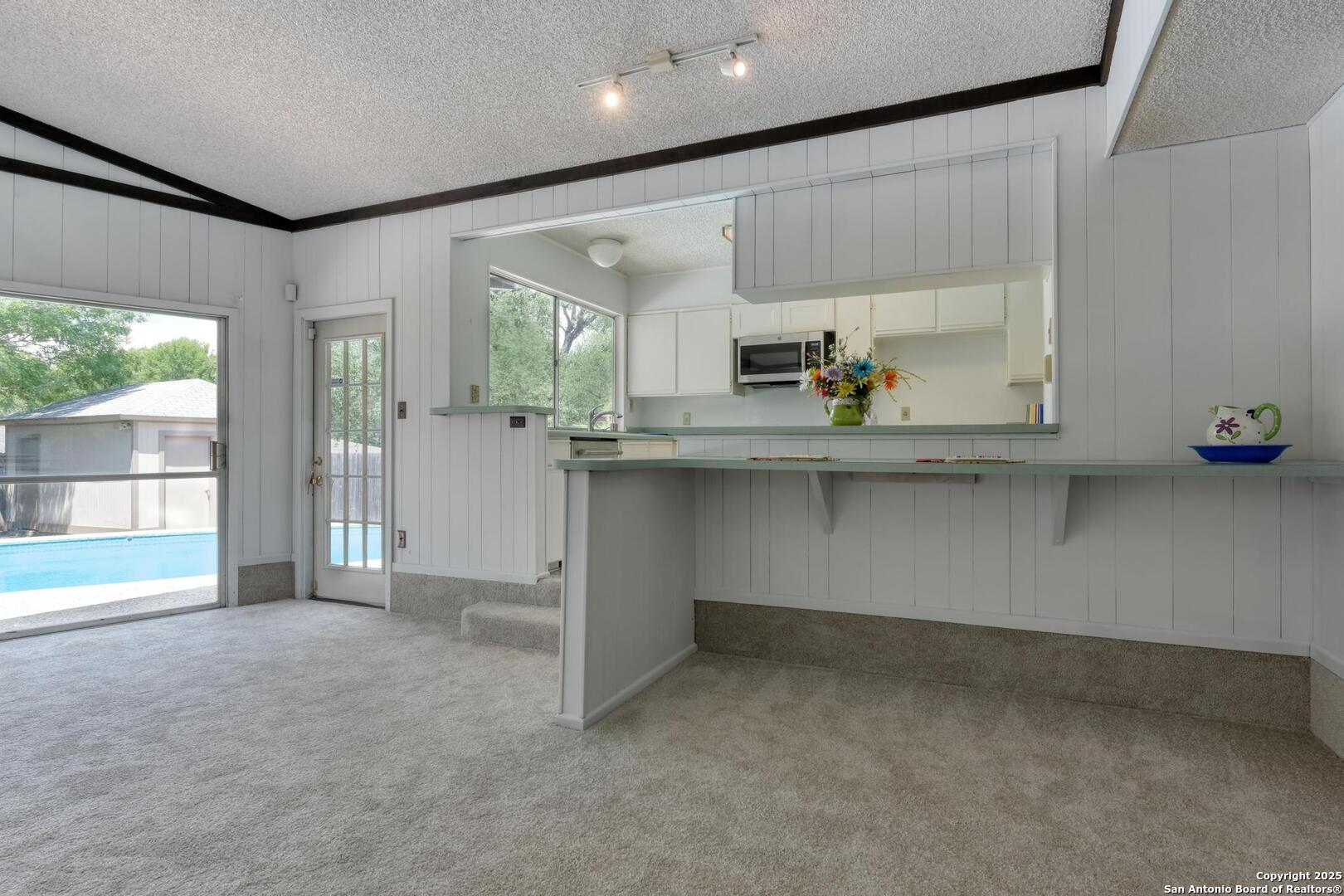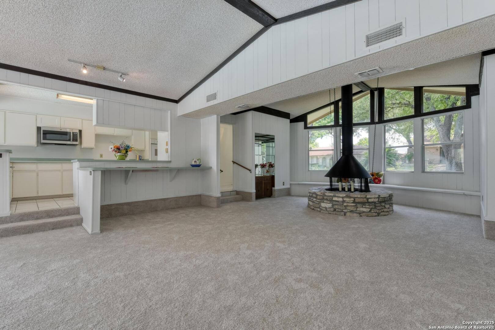 This single-story home with a rock exterior, siding accents, and mature trees offers wonderful curb appeal. Inside, you'll find 4 bedrooms and 3 baths in a layout designed for both comfort and entertaining. The sunken living room showcases vaulted ceilings, transom windows, and a bright, airy feel, complete with a cozy dry bar. A unique round rock wood-burning fireplace with a wide hearth adds charm and creates a perfect gathering spot. Fresh paint and recently installed carpet make the home move-in ready. The kitchen features a breakfast bar, smooth cooktop, built-in microwave, two built-in ovens, ample storage, and a large picture window that fills the space with natural light. The converted garage provides a versatile 4th bedroom with sliding glass doors, additional storage, and enough space for a refrigerator. Multiple sliding glass doors - from the living room, 4th bedroom, and primary suite - open to the sparkling in-ground pool, blending indoor and outdoor living. The primary suite includes direct pool access, a sunken shower, and generous vanity storage. Outdoors, enjoy the pool and a storage shed for your tools or pool equipment. With flexible spaces, modern updates, and plenty of room to gather, this property is perfect for everyday living and entertaining alike.