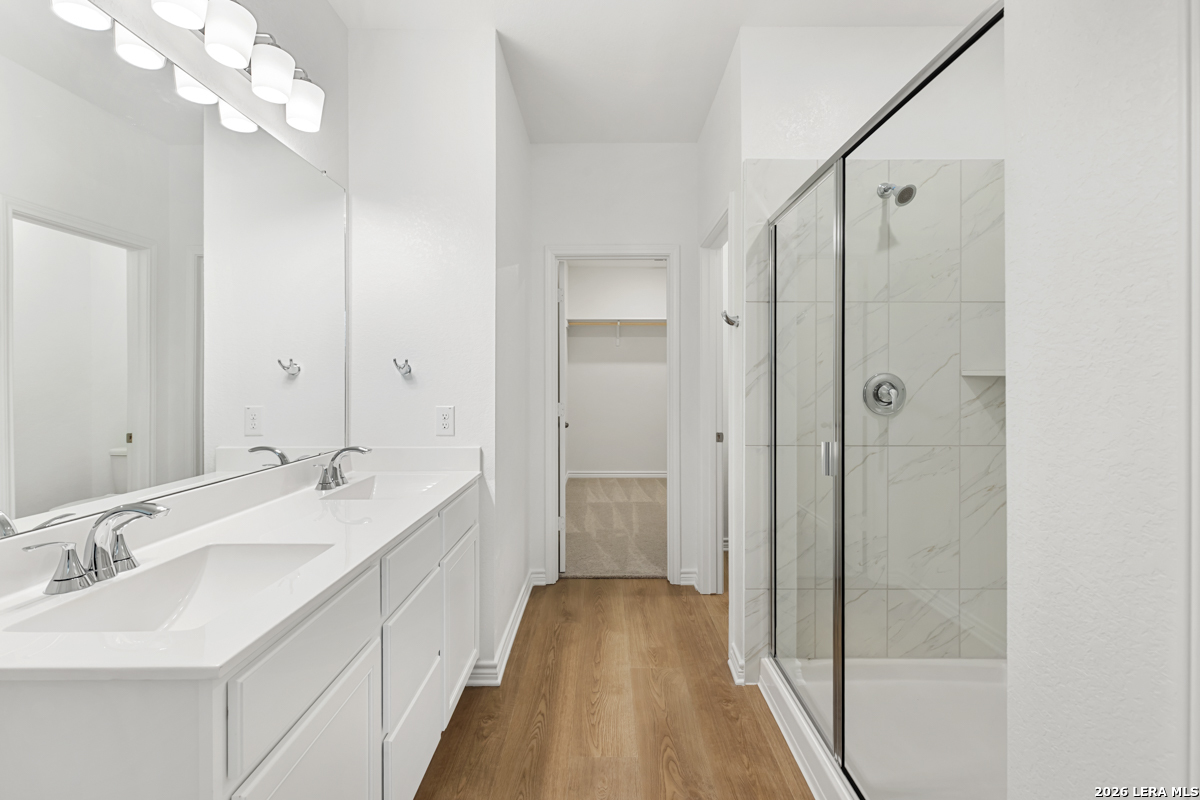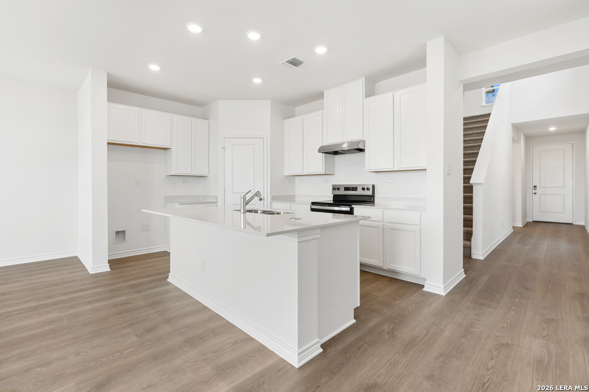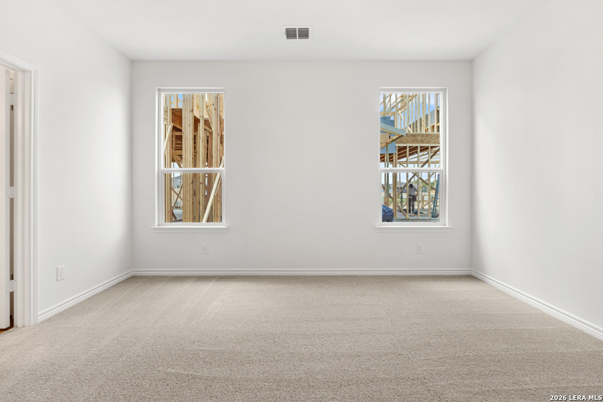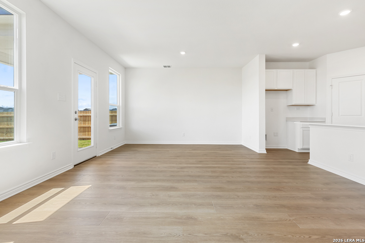 This inviting home features 9-ft. first-floor ceilings that enhance the spacious feel of the main living areas. The kitchen is beautifully appointed with Whirlpool stainless steel appliances, Woodmont Belmont 42-in. upper cabinets, elegant Silestone countertops in Linen Cream, and a complementary Daltile tile backsplash. The primary bath offers a raised vanity and a 42-in. shower with Daltile tile surround for a refined touch. Stylish details include a Carrara-style entry door, Kwikset Polo interior door hardware, Shaw carpet in the bedrooms, and durable vinyl plank flooring in the bathrooms, kitchen, and living room. A covered patio and fully sodded yard complete this well-designed home.