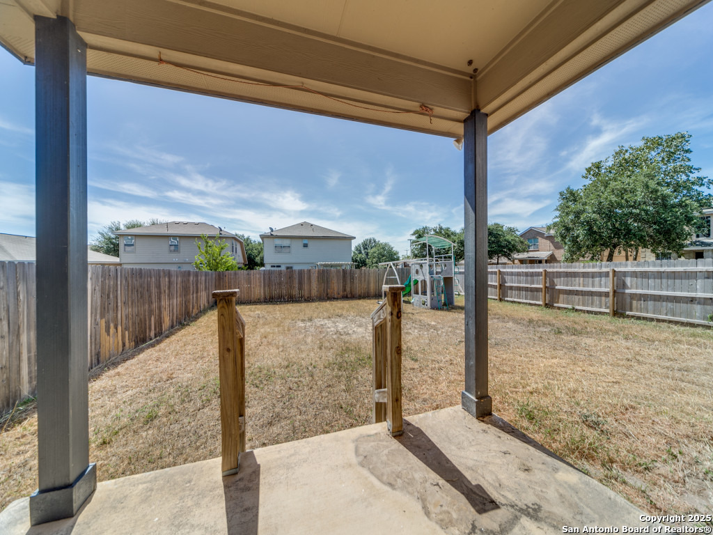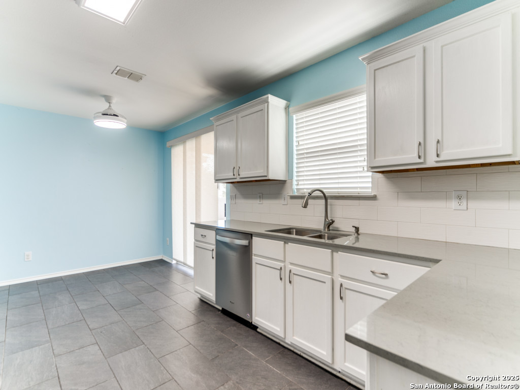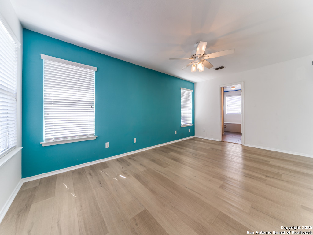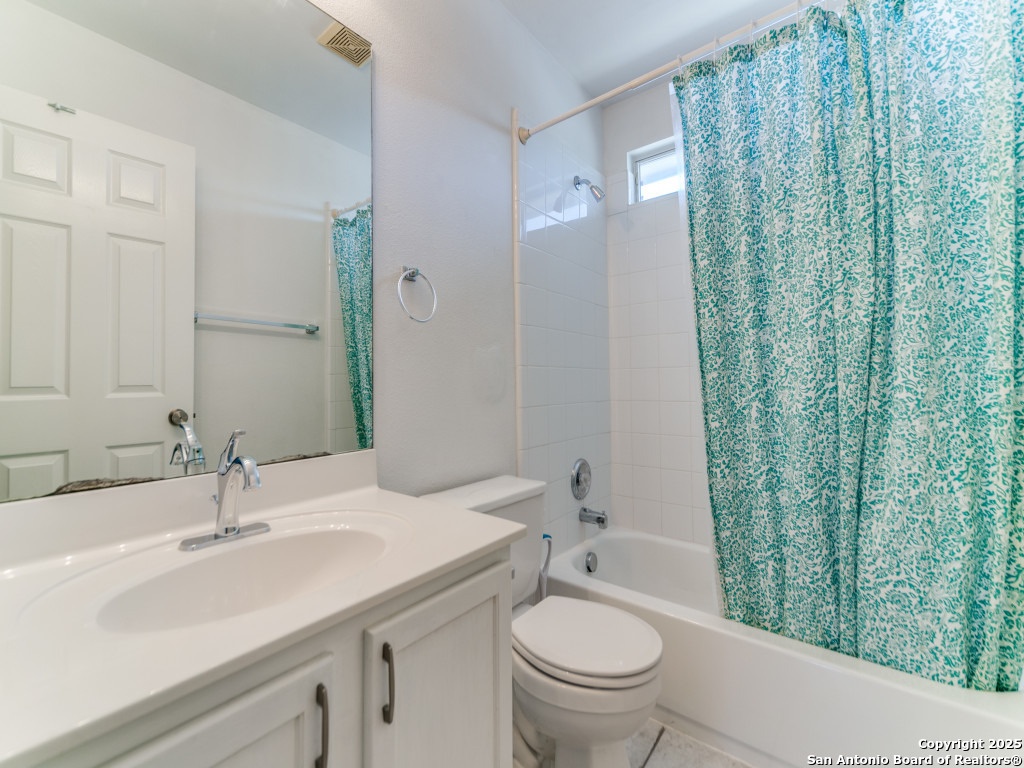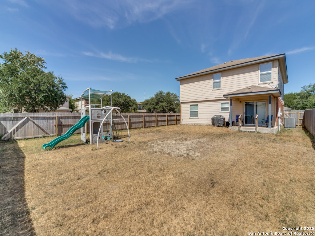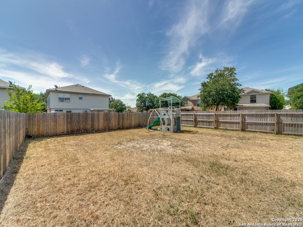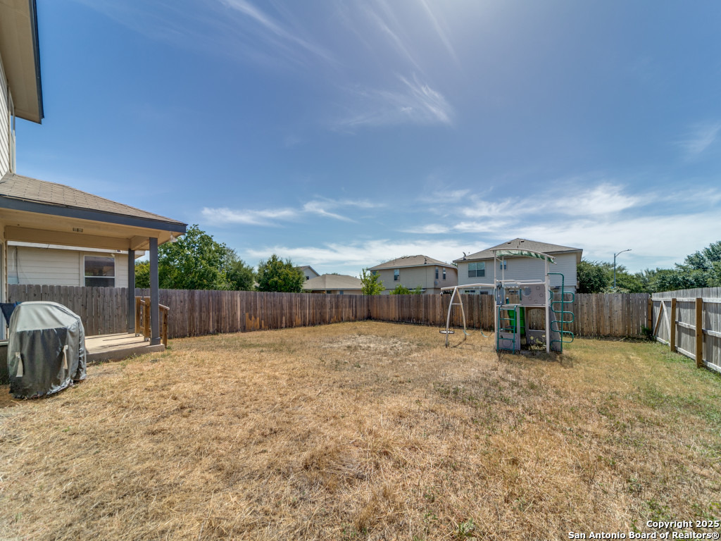 Light and bright 3 bedroom home with sleek on-trend updates in the North Central San Antonio neighborhood of Wildhorse just outside Loop 1604 near UTSA, Valero, The Rim, and the Medical Center! Peaceful grey walls and lovely wood-look luxury vinyl plank and ceramic tile flooring throughout. White blinds and designer Hunter ceiling fans make it cool and comfortable. Oversized tile in the kitchen and adjacent breakfast area accents the white tile backspash with quartz counters and white-washed cabinets. The upstairs primary suite offers a garden tub and a separate shower and is complete with dual vanities and classy oversized rectangular linen-look ceramic tile. A sunny and spacious upstairs gameroom offers a second living area with lots of versatility. The big backyard has a covered patio, firepit, bbq grill and a playscape that all convey with the home. The garage is outfitted with storage shelves and a garage door opener. Come see your San Antonio oasis - move-in ready and waiting for you...