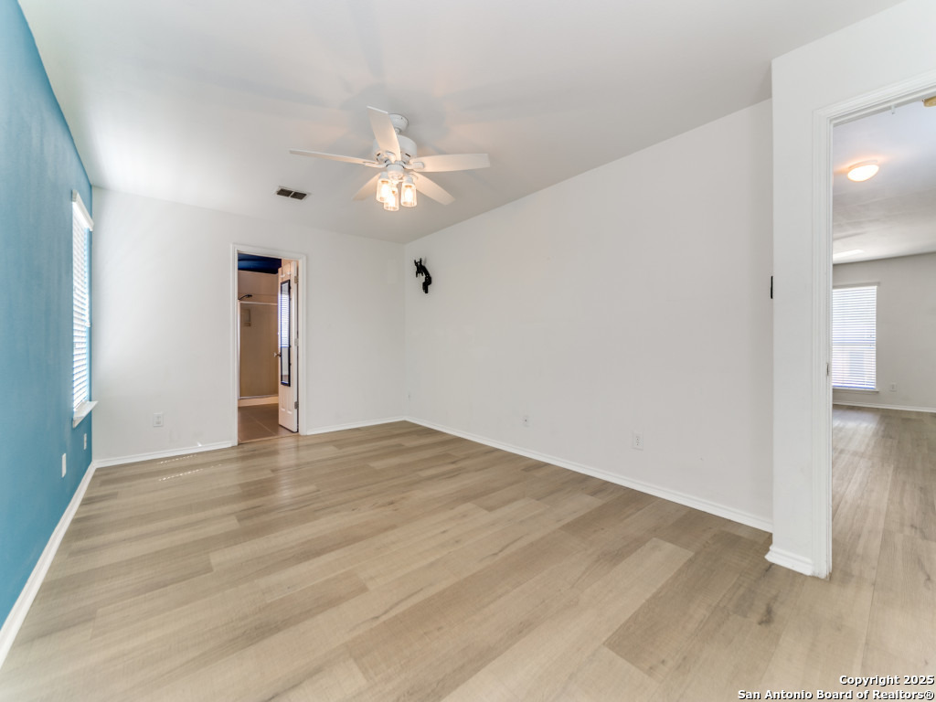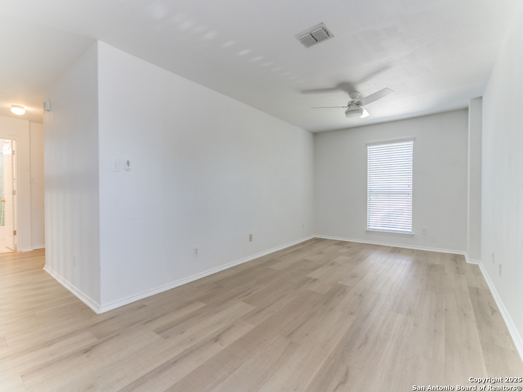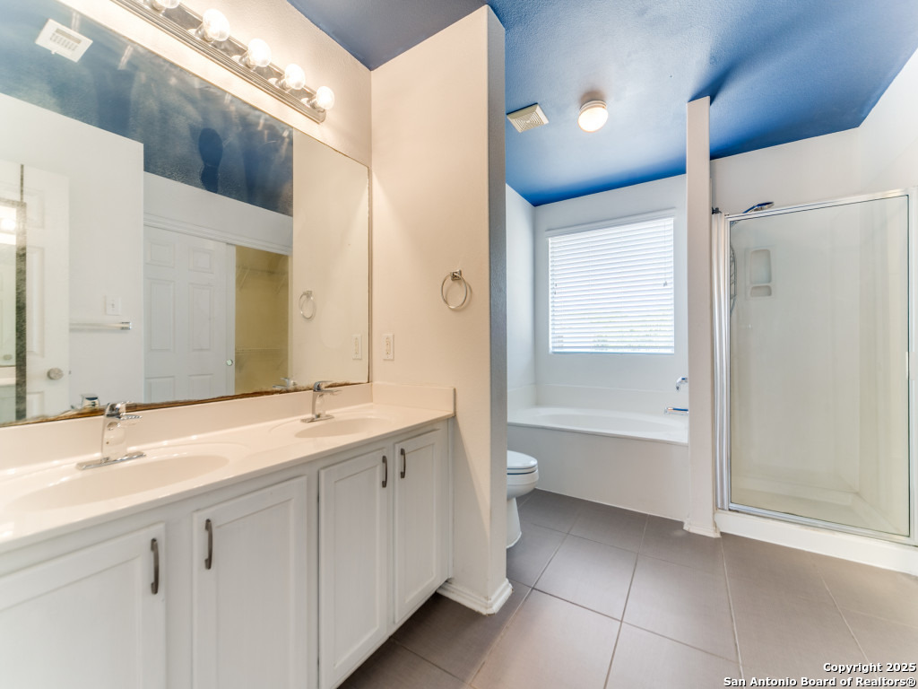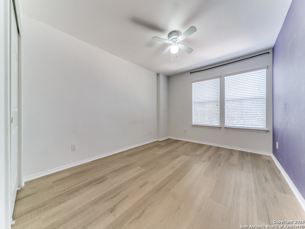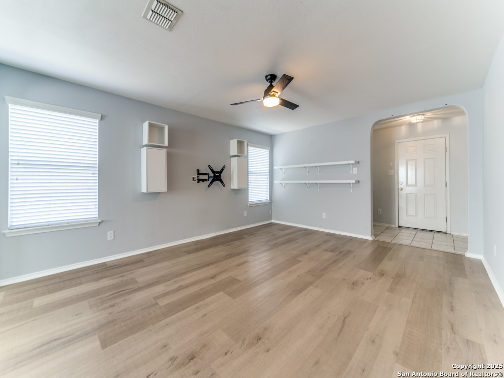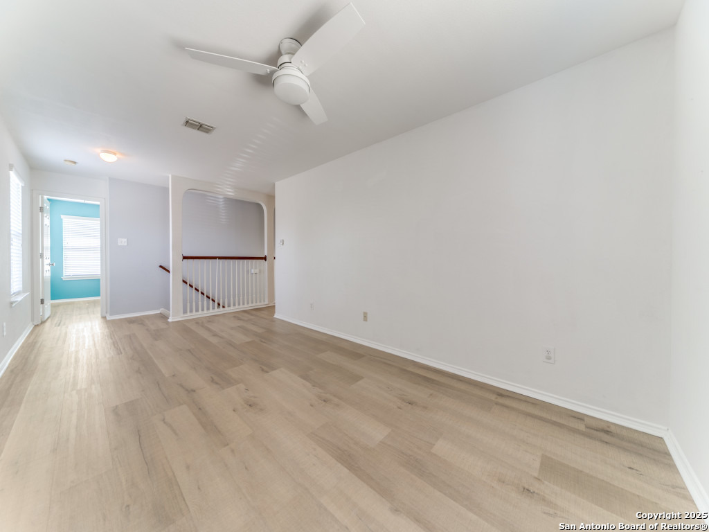 Light and bright 3 bedroom home with sleek on-trend updates in the North Central San Antonio neighborhood of Wildhorse just outside Loop 1604 near UTSA, Valero, The Rim, and the Medical Center! Peaceful grey walls and lovely wood-look luxury vinyl plank and ceramic tile flooring throughout. White blinds and designer Hunter ceiling fans make it cool and comfortable. Oversized tile in the kitchen and adjacent breakfast area accents the white tile backspash with quartz counters and white-washed cabinets. The upstairs primary suite offers a garden tub and a separate shower and is complete with dual vanities and classy oversized rectangular linen-look ceramic tile. A sunny and spacious upstairs gameroom offers a second living area with lots of versatility. The big backyard has a covered patio, firepit, bbq grill and a playscape that all convey with the home. The garage is outfitted with storage shelves and a garage door opener. Come see your San Antonio oasis - move-in ready and waiting for you...