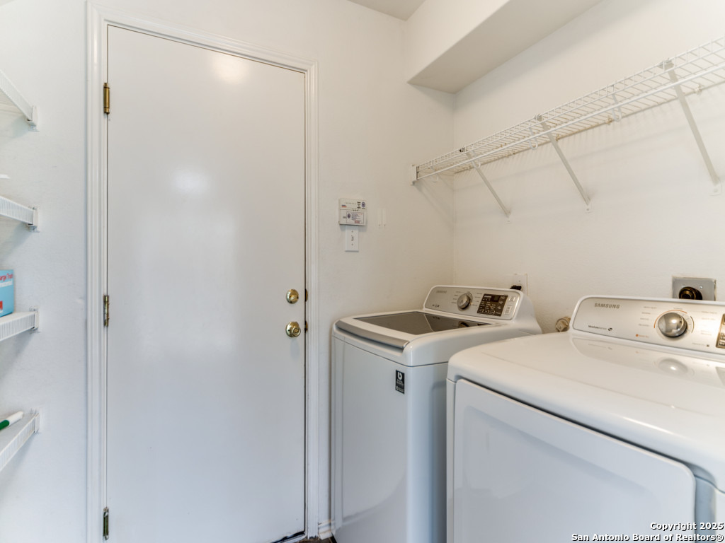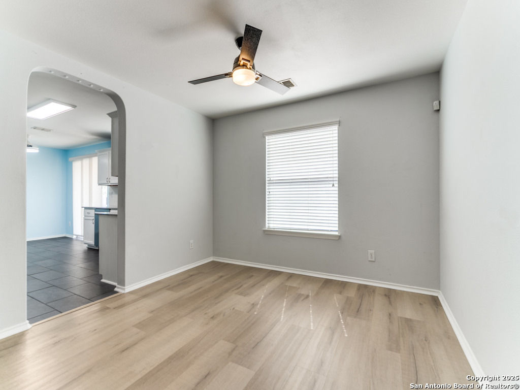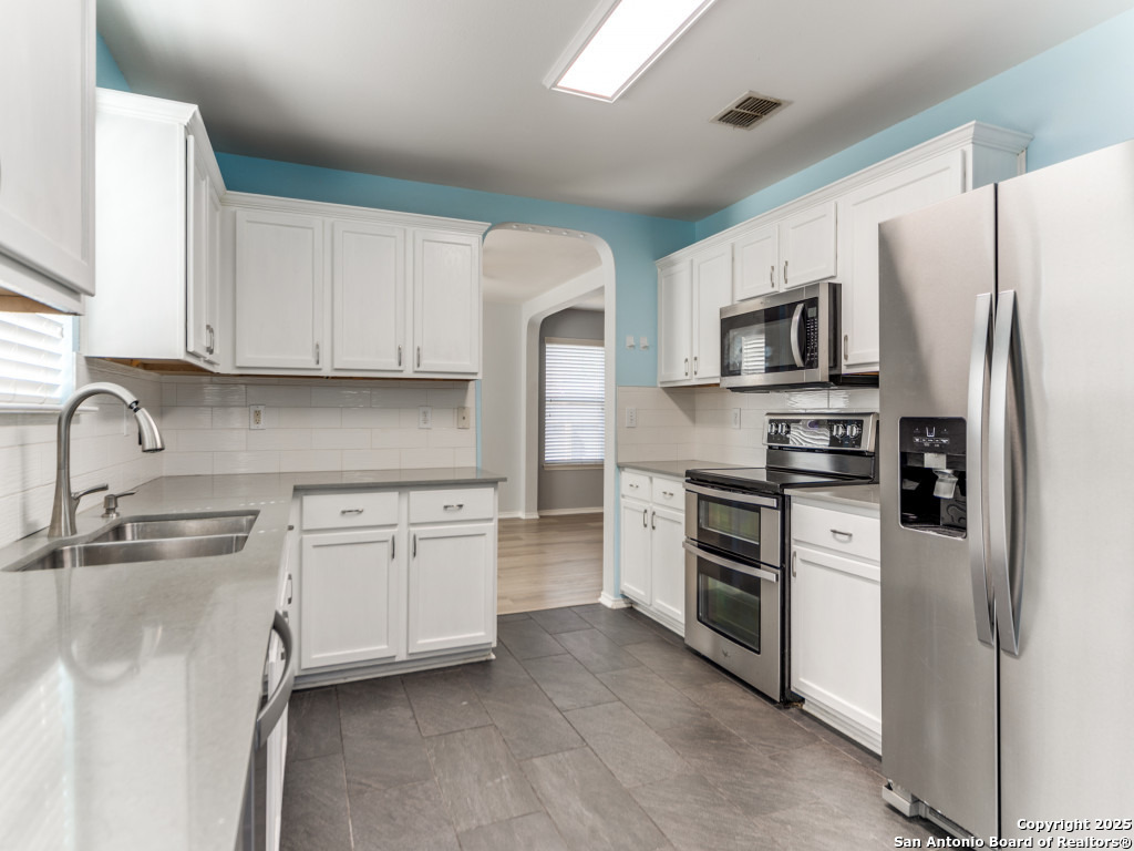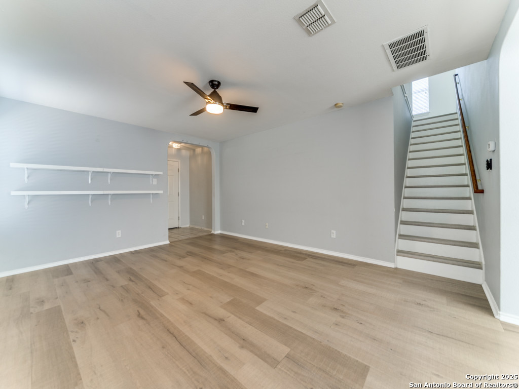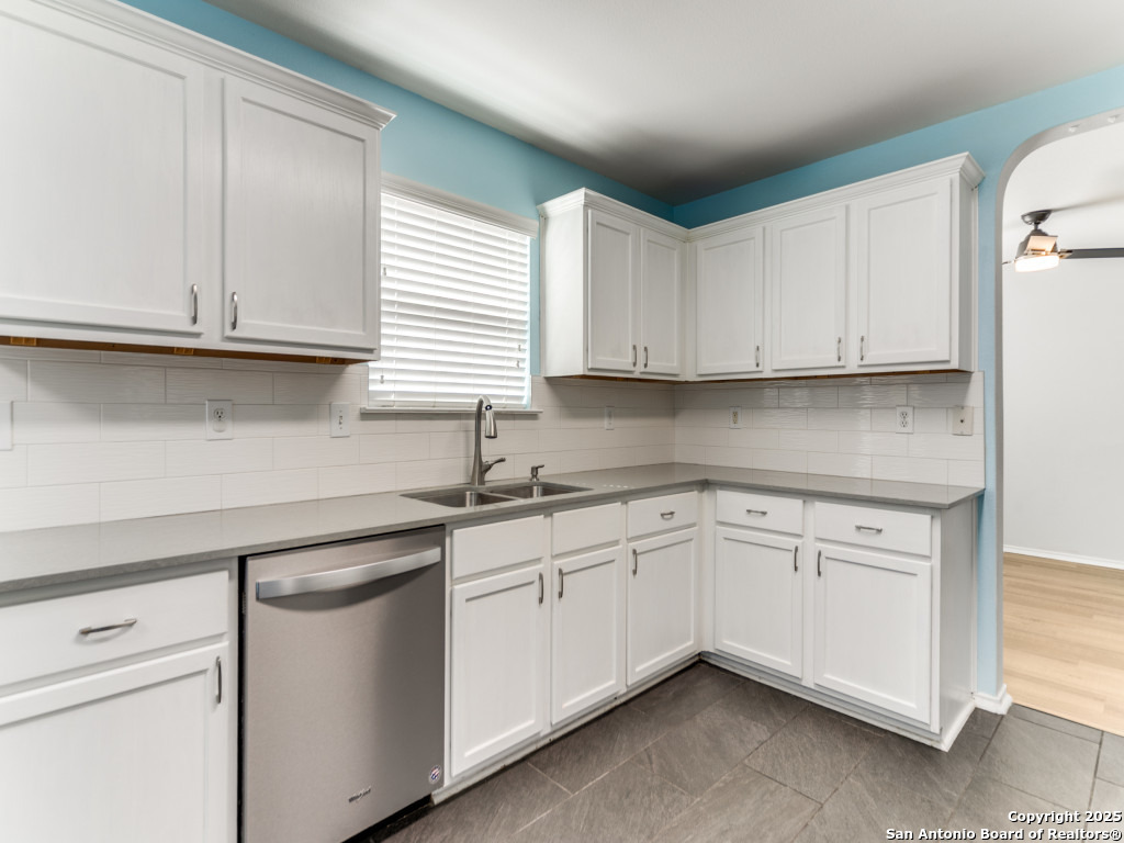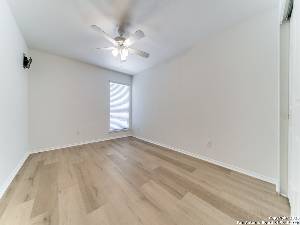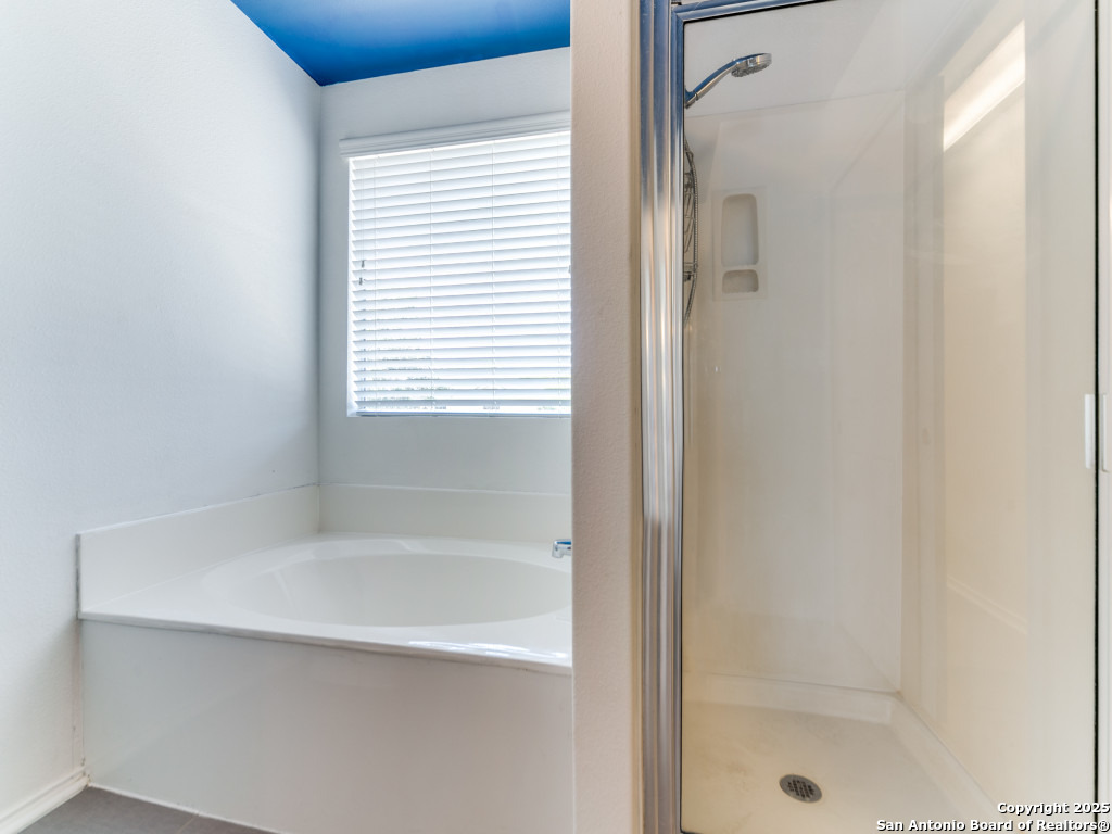Light and bright 3 bedroom home with sleek on-trend updates in the North Central San Antonio neighborhood of Wildhorse just outside Loop 1604 near UTSA, Valero, The Rim, and the Medical Center! Peaceful grey walls and lovely wood-look luxury vinyl plank and ceramic tile flooring throughout. White blinds and designer Hunter ceiling fans make it cool and comfortable. Oversized tile in the kitchen and adjacent breakfast area accents the white tile backspash with quartz counters and white-washed cabinets. The upstairs primary suite offers a garden tub and a separate shower and is complete with dual vanities and classy oversized rectangular linen-look ceramic tile. A sunny and spacious upstairs gameroom offers a second living area with lots of versatility. The big backyard has a covered patio, firepit, bbq grill and a playscape that all convey with the home. The garage is outfitted with storage shelves and a garage door opener. Come see your San Antonio oasis - move-in ready and waiting for you...