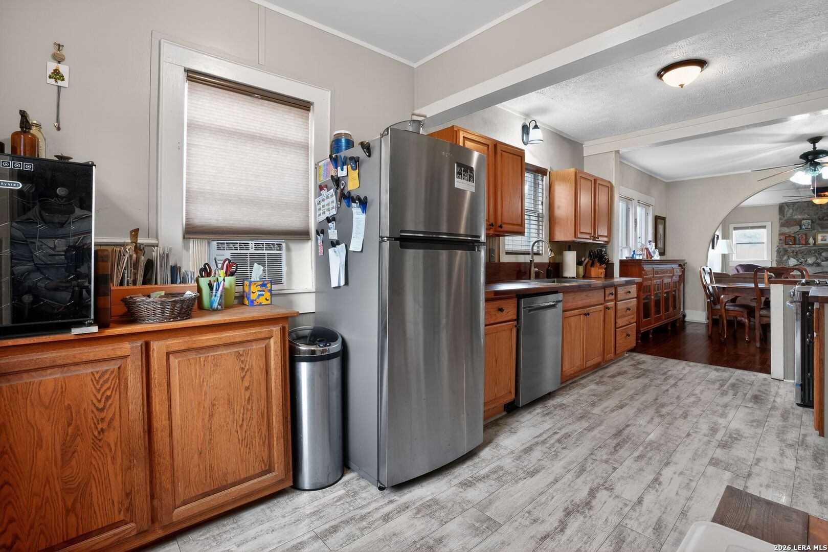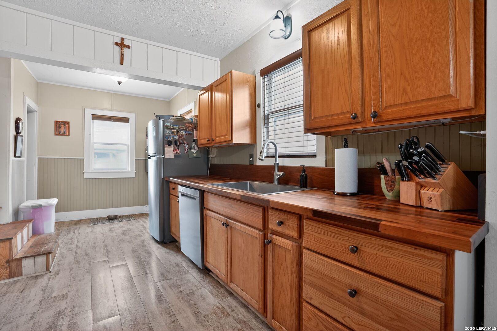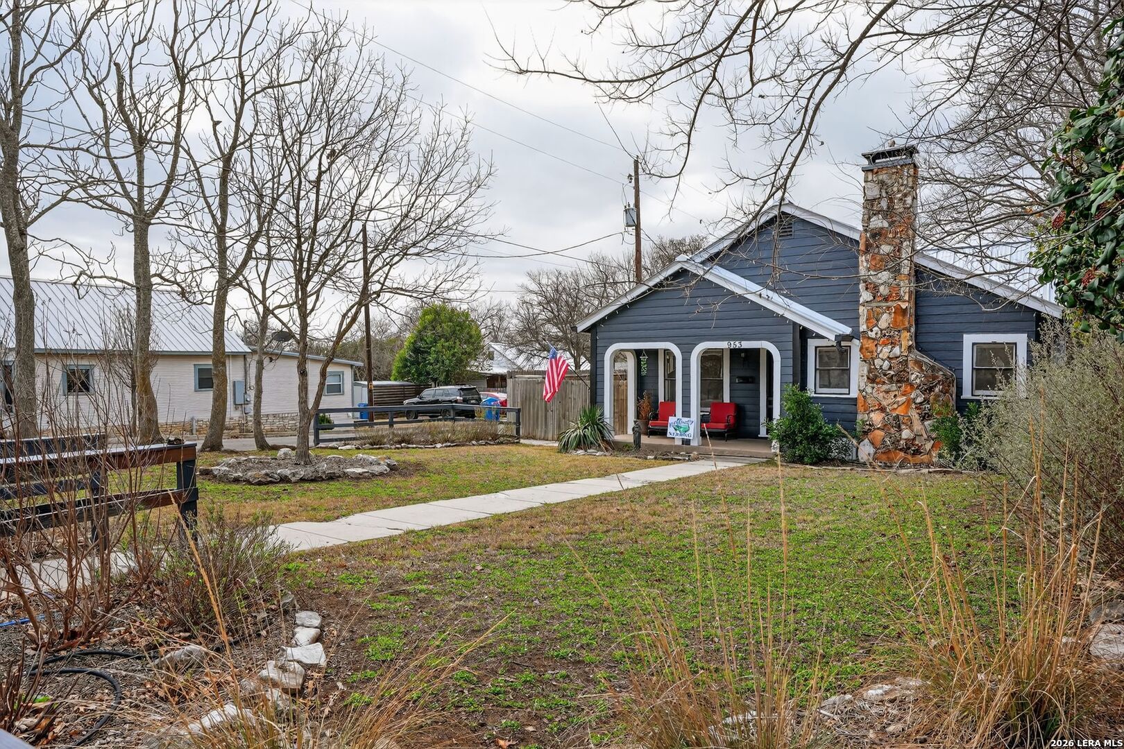 Come check out this charming 3 bedroom, 2 full bath home, chocks full of character. From the stone and rock wood burning fireplace to the hardwood floors, you will find comfort and relaxation in this well-maintained home. With its open floor plan, the house is full of natural light with window coverings throughout, central heat and air conditioning, high ceilings and overhead fans. Undercabinet lighting shines down on the walnut kitchen counter tops with all newer stainless appliances including the natural gas oven and stove. The large farmers sink is great for those large pots and pans Two spacious bedrooms and a master bath with double sinks. The third bedroom upstairs is a great bedroom and hangout for the kiddos. Or maybe an office, a reading room with a view or a quiet place to just sit back and relax. In additional there is plenty of storage in the back room. Walk out onto the private back deck with plenty of space for smoking your favorite meats and grilling your own vegetables you can grow right there in the raised garden beds. You'll find a backyard lined with established native landscaping attracting butterflies, hummingbirds and songbirds. A privacy fence surrounds the backyard. The newer metal roof and recently painted exterior of the house will give you years of maintenance free service. In addition, the fully covered two car carport will protect your vehicles from the Texas hailstorms. Store your tools and outdoor equipment in the 14 by 12 workshop that includes workbenches and shelving. Just a few blocks from the public golf course, several churches, the river and downtown are but a short walk through the neighborhood. HEB is only a seven-minute drive, and Peterson hospital and many of the medical offices are less than 10 minutes away. Built in 1940 in a historic part of Kerrville, and a much sought after neighborhood, this house is a gem and a must see.