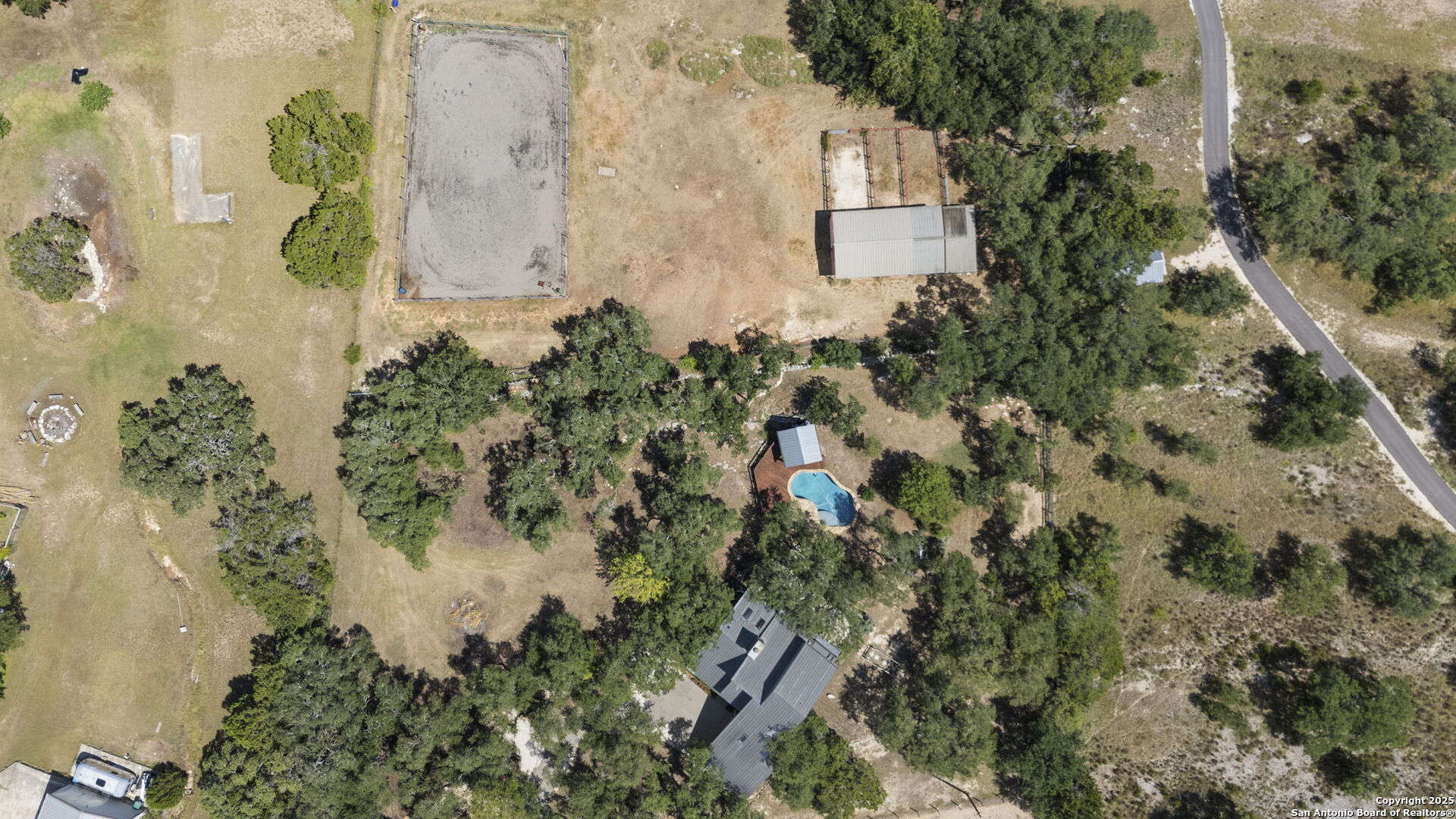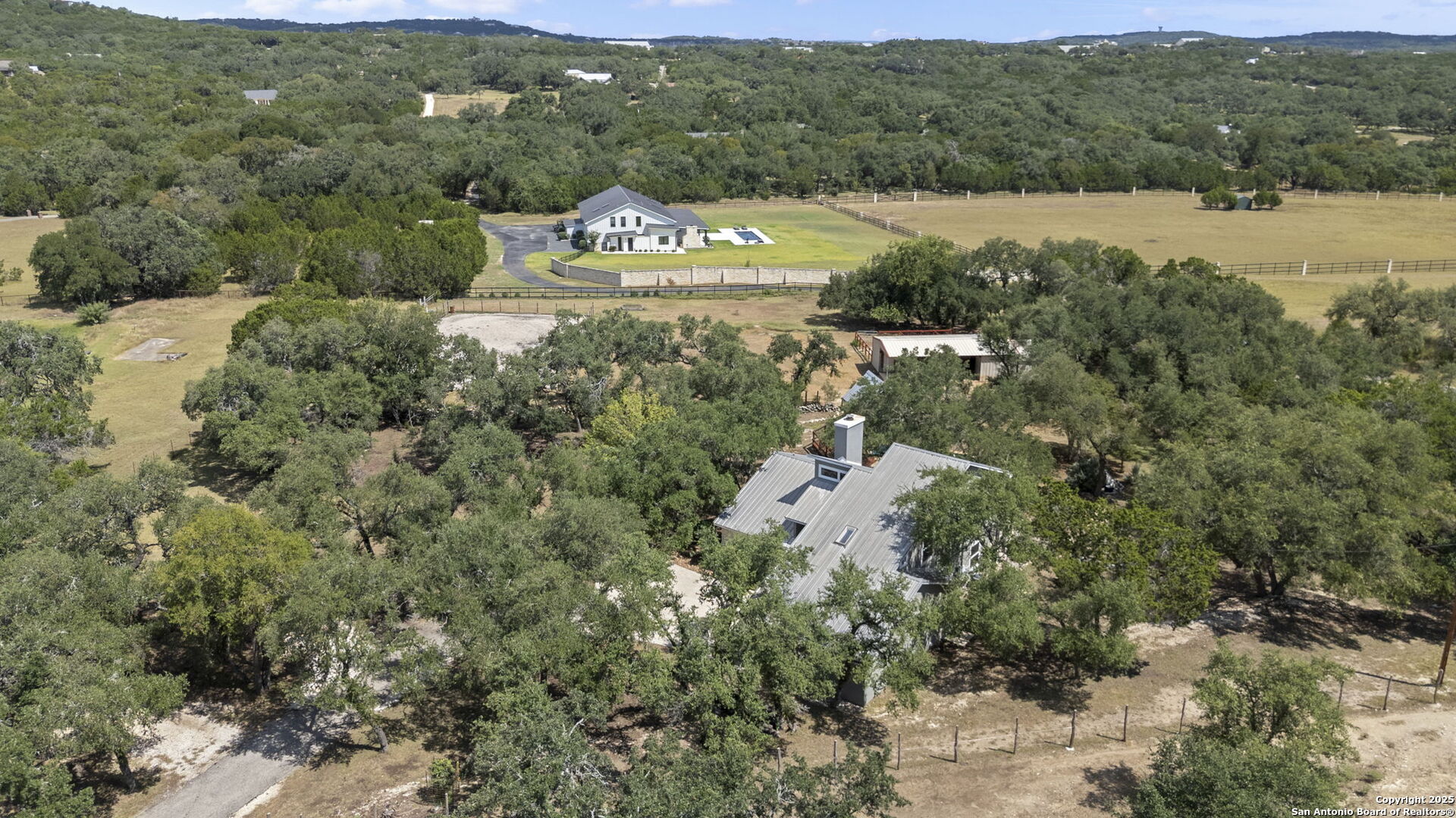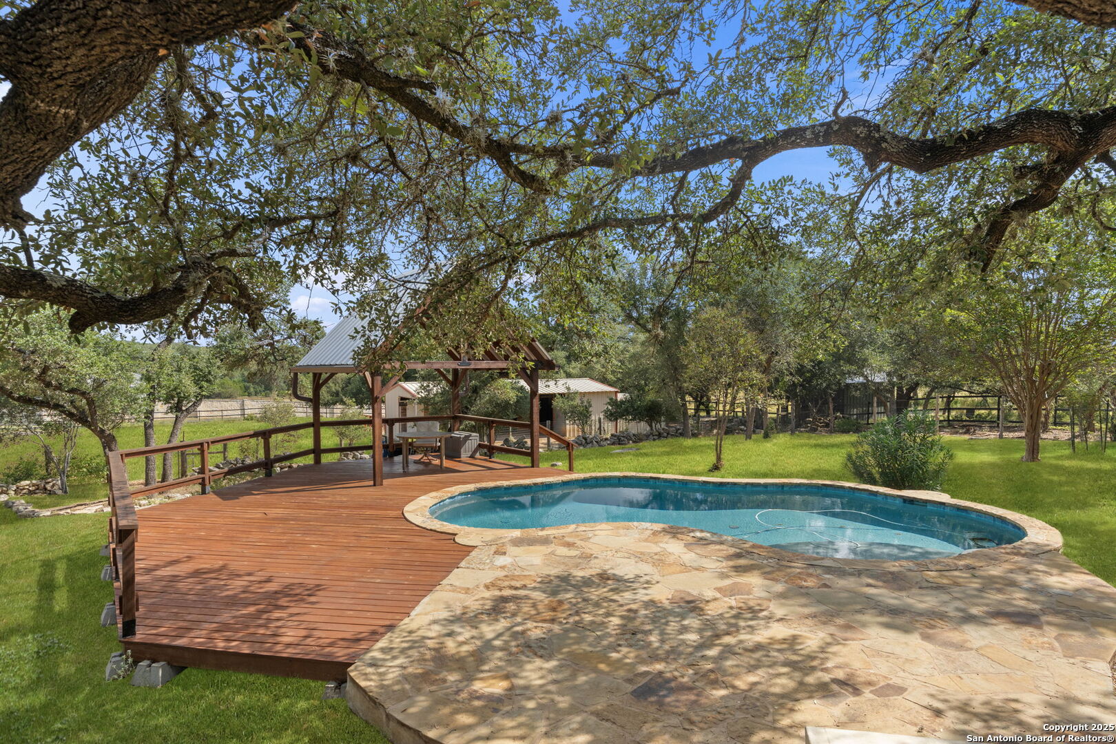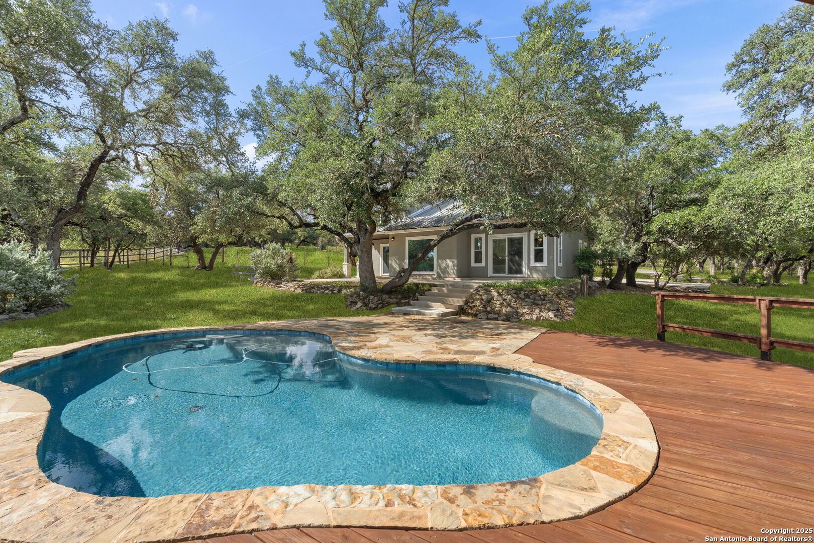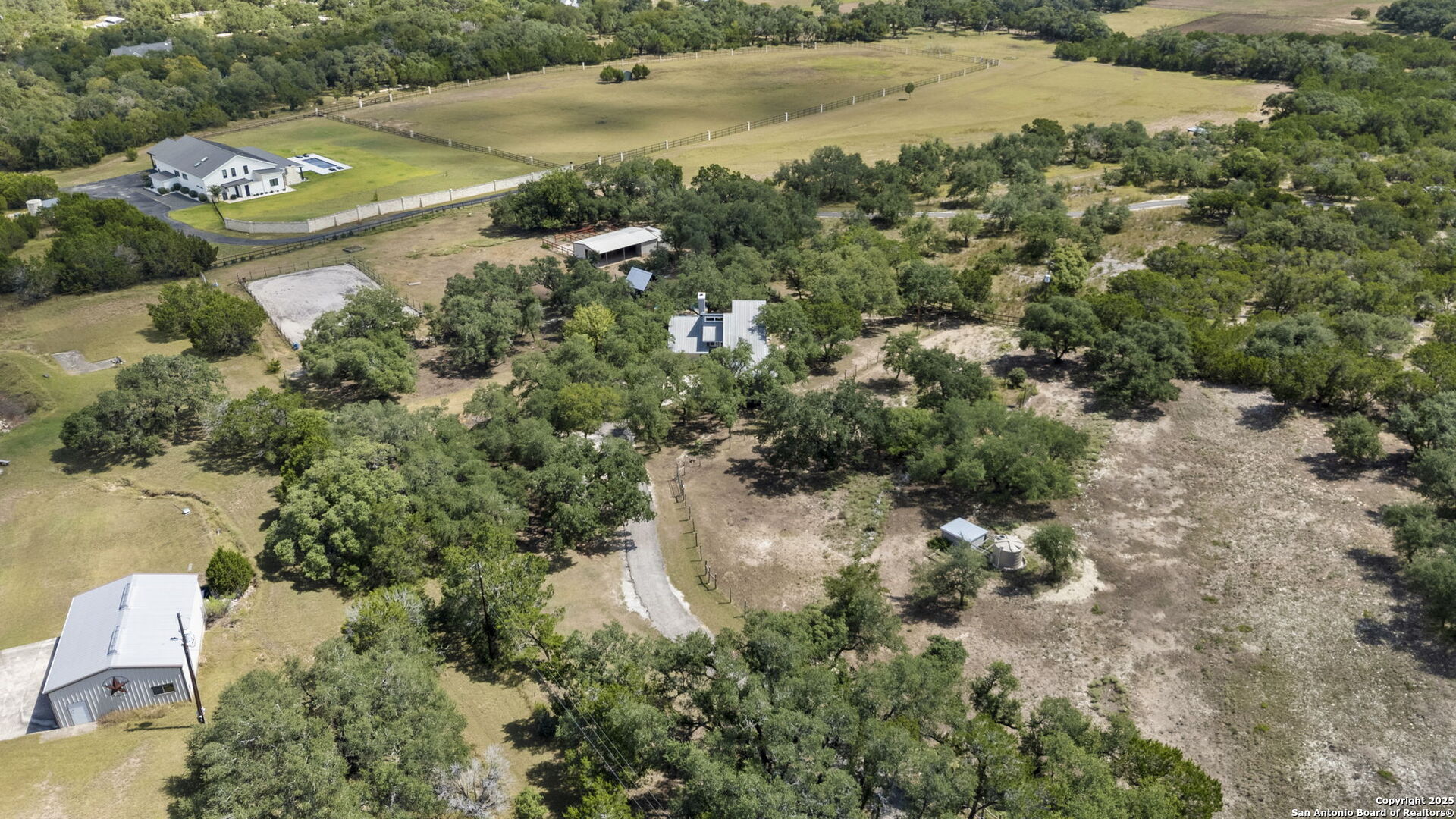 Your dream Hill Country ranchette awaits! Situated on just over 5 private acres, this charming stone and stucco home offers the perfect blend of country living and modern comfort. Surrounded by mature oak trees, the property is fenced and cross-fenced, making it ideal for horses, livestock, and outdoor living. The home features approximately 1,972 sq. ft. of thoughtfully designed living space with 3 bedrooms and 2.5 baths. Inside, you'll find soaring ceilings, a striking rock fireplace, and abundant natural light. Skylights brighten three rooms, while the open concept floor plan provides a spacious and inviting atmosphere. Upstairs, a loft serves as a versatile area for an office or sitting room. Recent upgrades include new flooring, carpet, all New high grade windows, updated fixtures, and fresh paint throughout ensuring a move-in-ready experience. Step outside and enjoy your very own backyard retreat with a sparkling swimming pool with a deck and pavilion that sets the stage for endless entertaining and relaxation. The expansive 40' x 20' partially covered back porch offers the perfect spot to unwind and take in the views of the Hill Country landscape. Equestrian enthusiasts will appreciate the well-equipped facilities, including an arena, 3-stall horse barn, tack room, and hay storage. Conveniently located with easy access to Highway 281 and only 20 minutes north of San Antonio, this property combines the tranquility of ranch living with the convenience of being close to city amenities.