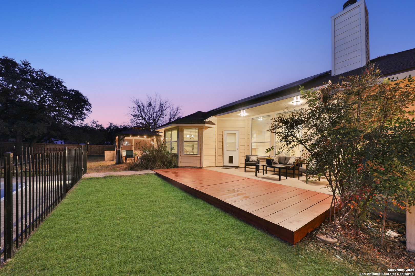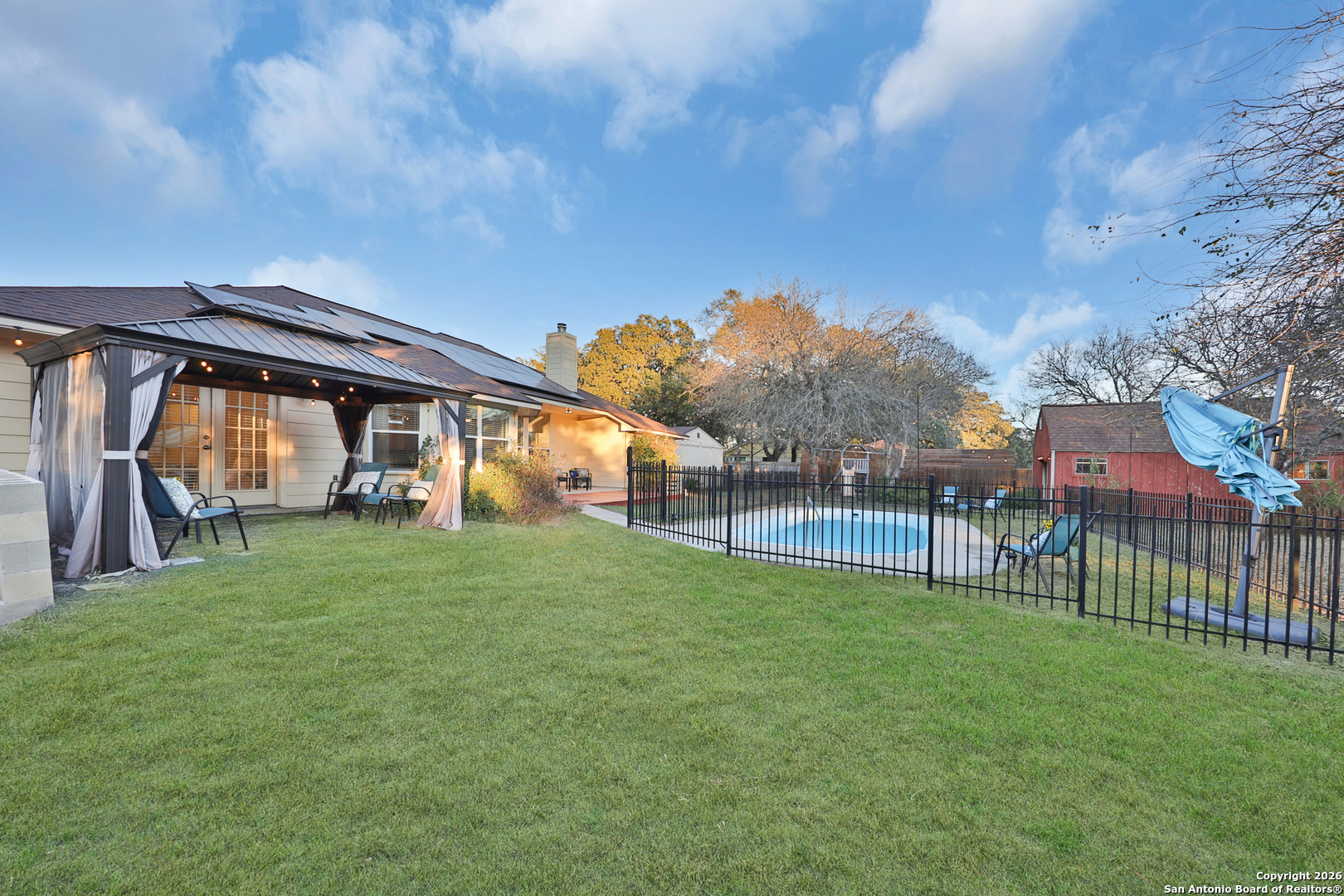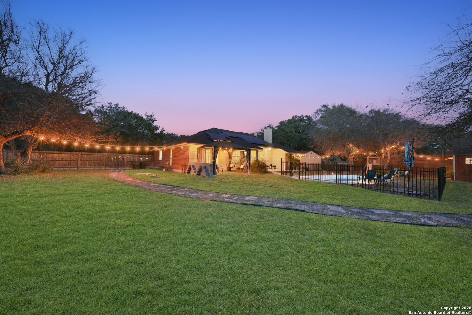 OPEN HOUSE: SAT. & SUN., JAN 10TH & 11 1-5PM Nestled on a scenic 1.02-acre corner lot, this beautiful 4-bedroom, 3.5-bathroom home offers 2,324 square feet of inviting living space surrounded by mature trees, vibrant landscaping, and serene outdoor features. Located in the highly sought-after Geronimo Forest Subdivision, this property perfectly blends comfort, functionality, and natural beauty. Step inside to discover a bright and open floor plan with soaring ceilings and expansive windows that fill the home with natural light. The spacious living room centers around a cozy fireplace-perfect for family gatherings or quiet evenings. The kitchen is well-equipped with stainless steel appliances, abundant cabinetry, and a convenient breakfast bar overlooking the backyard-a great spot to enjoy morning coffee or casual meals. All bedrooms are generously sized, offering personal space and privacy for everyone. The primary suite is a true retreat, complete with a luxurious ensuite bathroom featuring dual vanities, a whirlpool tub, a separate walk-in shower and private access to the outdoor space with a charming gazebo. The home includes a desirable mother-in-law suite with its own sitting area, bedroom, and connecting ensuite bath-ideal for multi-generational living or extended guests. Step outside on the expansive deck and into your own backyard oasis. Enjoy a sparkling pool for summer relaxation, ample green space on the lush 1-acre lot, with plenty of room to roam, surrounded by shaded mature trees. Garden enthusiasts will appreciate the fully equipped greenhouse, and hobbyists will love the detached workshop. This outdoor space is thoughtfully designed for both entertaining and everyday enjoyment. Additional highlights include an energy-efficient solar panel system to help reduce utility costs while supporting sustainable living. Tucked away in a peaceful, friendly neighborhood with easy access to schools, shopping, dining, Government Canyon, and Medina Lake, this exceptional property offers space, privacy, and an outstanding lifestyle.