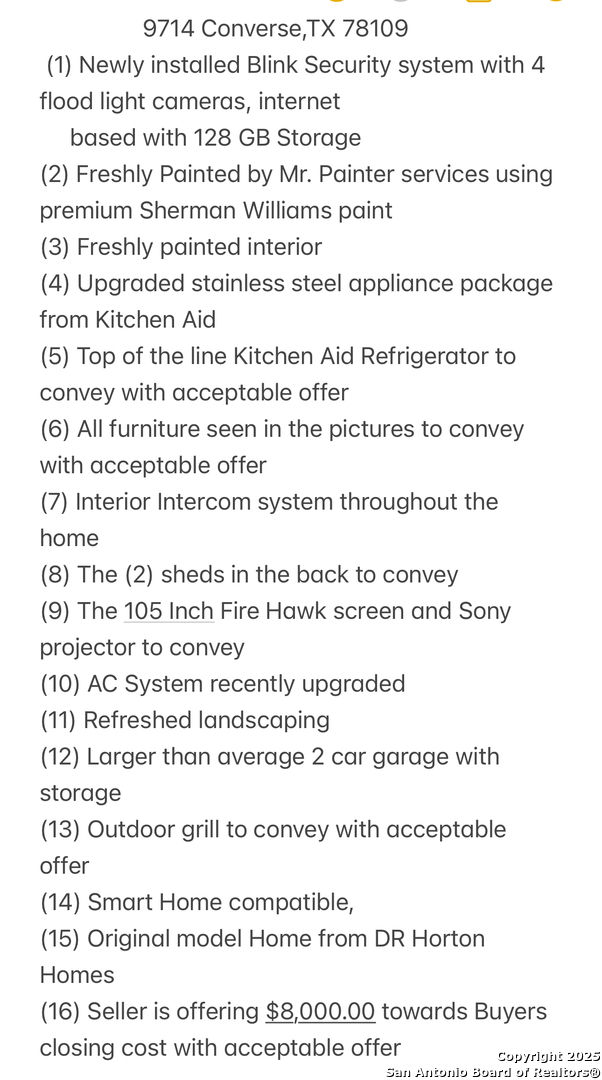 4.25o/o FHA-ASSUMABLE SELLER LOAN. $8,000 Buyers Credit , Converse offers a slow pace/quiet community. There are green spaces and parks nearby. "WWoWW" What a house! This property has all the bells and whistles!!! 4 bedrooms, 3.5 bathrooms, "2 DINING AREAS, "3109 sq feet. It has several upgraded/updated features and it is well maintained throughout. NEW Inter/Exterior SW Paint, Beautiful landscaping, covered patio, HUGE Gameroom and a Custom MEDIA ROOM with 105'' Firehawk TV screen with High Resolution projector Camera and is prewired for surround sound. Living Room has 5 foot Fan Blade w/Remote, All Furniture included: 2 Tables and chairs, Master has Entertainment center w/TV and disc player, upstairs has a beautiful center peice with Mirror. Master bedroom downstairs, (No carpet on the first floor), NEW Honey-Well thermostat, New Security Camera system with bluetooth technology w/USB ports access, 2 Large Weather Proof sheds convey, Programmable Sprinkler System, Recent Kitchen-Aid stainless steel Appliances. Great location close to 2 Military Bases and 2 MAJOR Shopping Mall areas. SEE list of Recent Upgrades at Photo #6,7,8, " A MUST SEE " .
