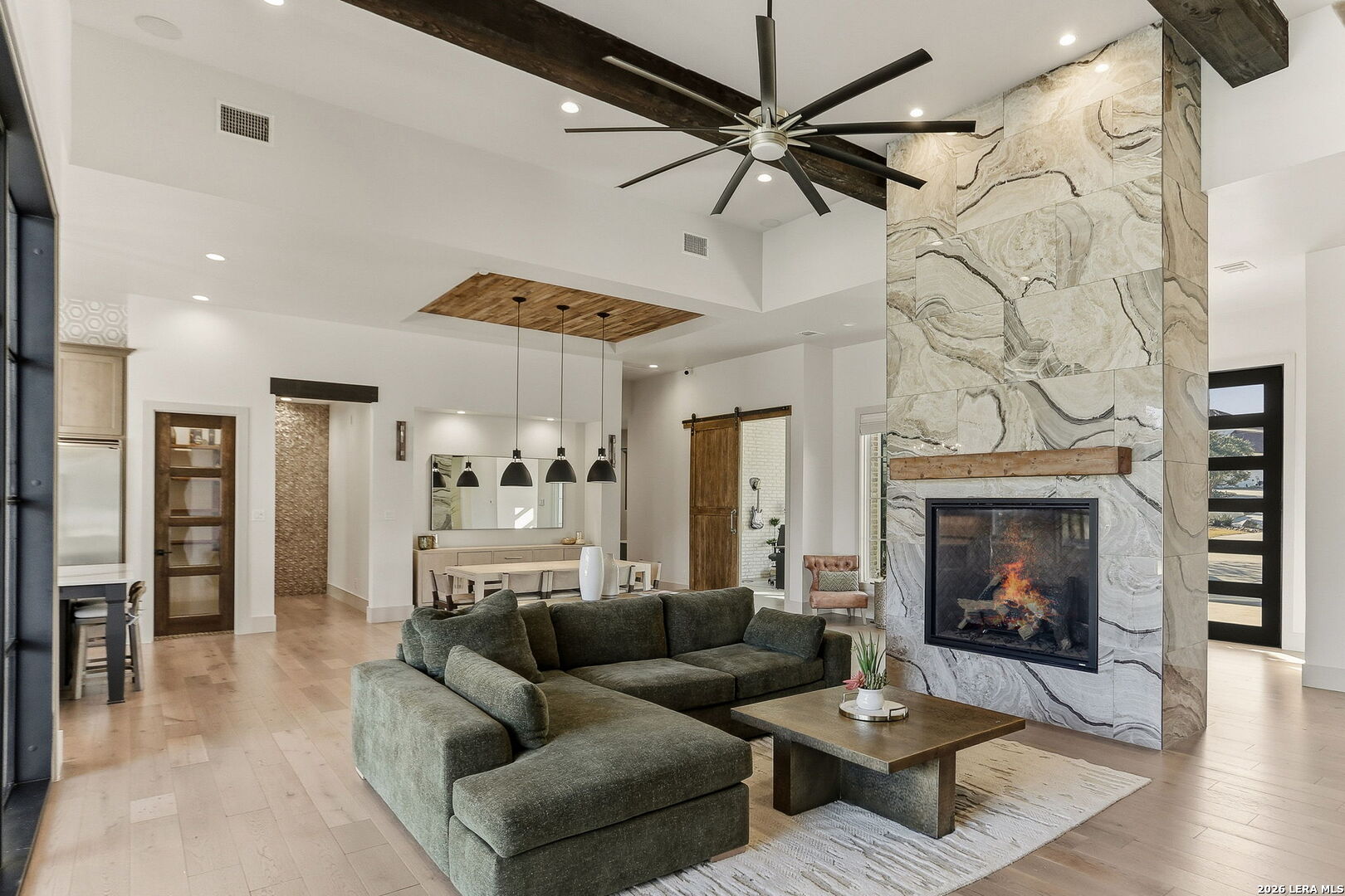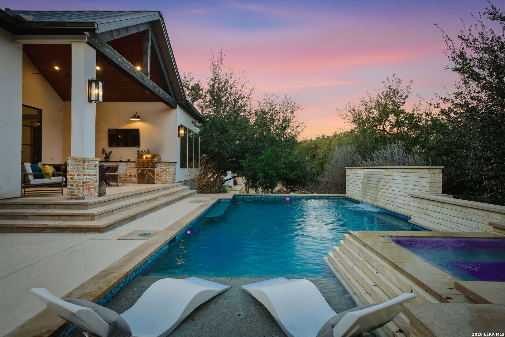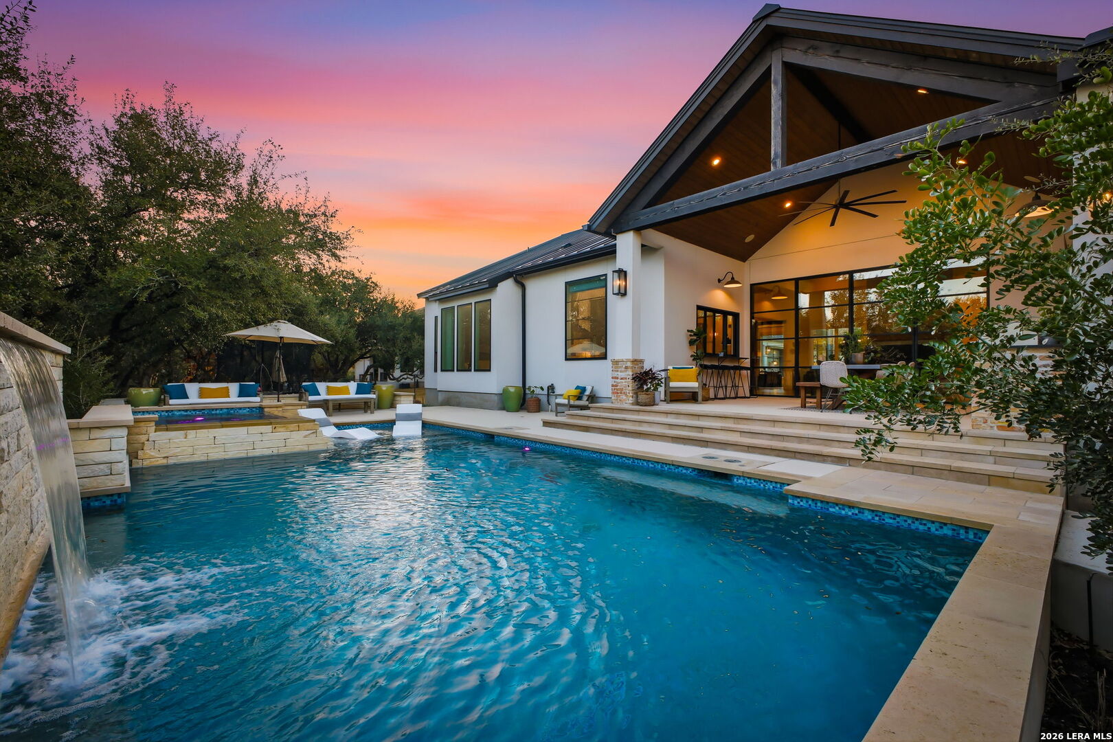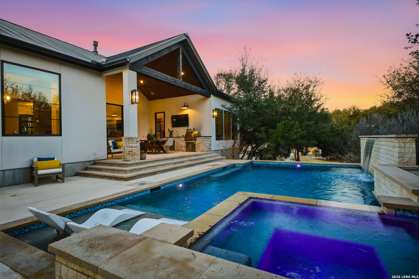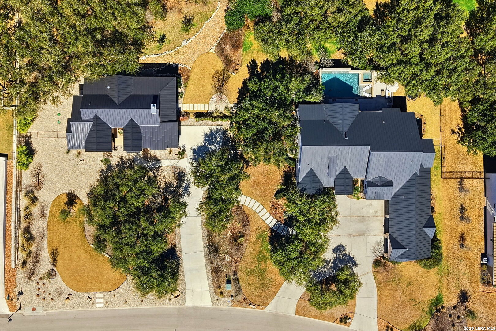 Two Homes. One Estate. Endless Possibilities. Nestled behind the prestigious gates of Cantera Hills, 9719 Midsomer Place presents a rare opportunity to own a private compound where scale, design, and flexibility converge. Set on 1.28 acres, this GSABA Parade of Homes "People's Choice" award-winning estate, built by Casadomaine, features two fully independent luxury residences-thoughtfully designed for multigenerational living, private guest accommodations, or income-producing potential. Spanning over 6,000 square feet of curated living space, both homes showcase bespoke finishes, soaring ceilings with exposed wood beams, and expansive windows that flood the interiors with natural light. Designer lighting, statement fireplaces, and retractable glass doors create a seamless blend of indoor and outdoor living. Each residence is anchored by a chef-inspired kitchen featuring top-tier stainless steel appliances and custom Michael Edwards cabinetry, flowing effortlessly into grand living spaces designed for both elevated entertaining and everyday comfort. The primary living quarters offer a true private retreat experience, complemented by spa-inspired baths and custom-designed closet, while additional suites provide comfort and privacy throughout. A dedicated office, wet bar, fitness space, and pet spa further enhance the home's thoughtful livability. Outdoors, a resort-style setting unfolds with a fully equipped pavilion kitchen, sparkling pool, spa, and cascading water features, creating an atmosphere equally suited for quiet relaxation or refined entertaining. With separate entrances, utilities, and garages for each residence, the estate offers both independence and cohesion within one of San Antonio's most desirable gated communities. Located just minutes from La Cantera, The Rim, and premier dining and shopping, this is a residence that delivers both privacy and proximity. A rare offering designed for those who expect nothing less than exceptional.
