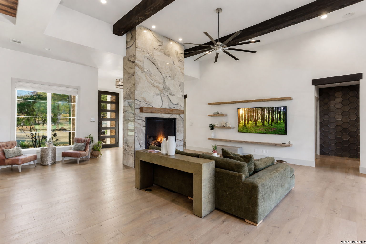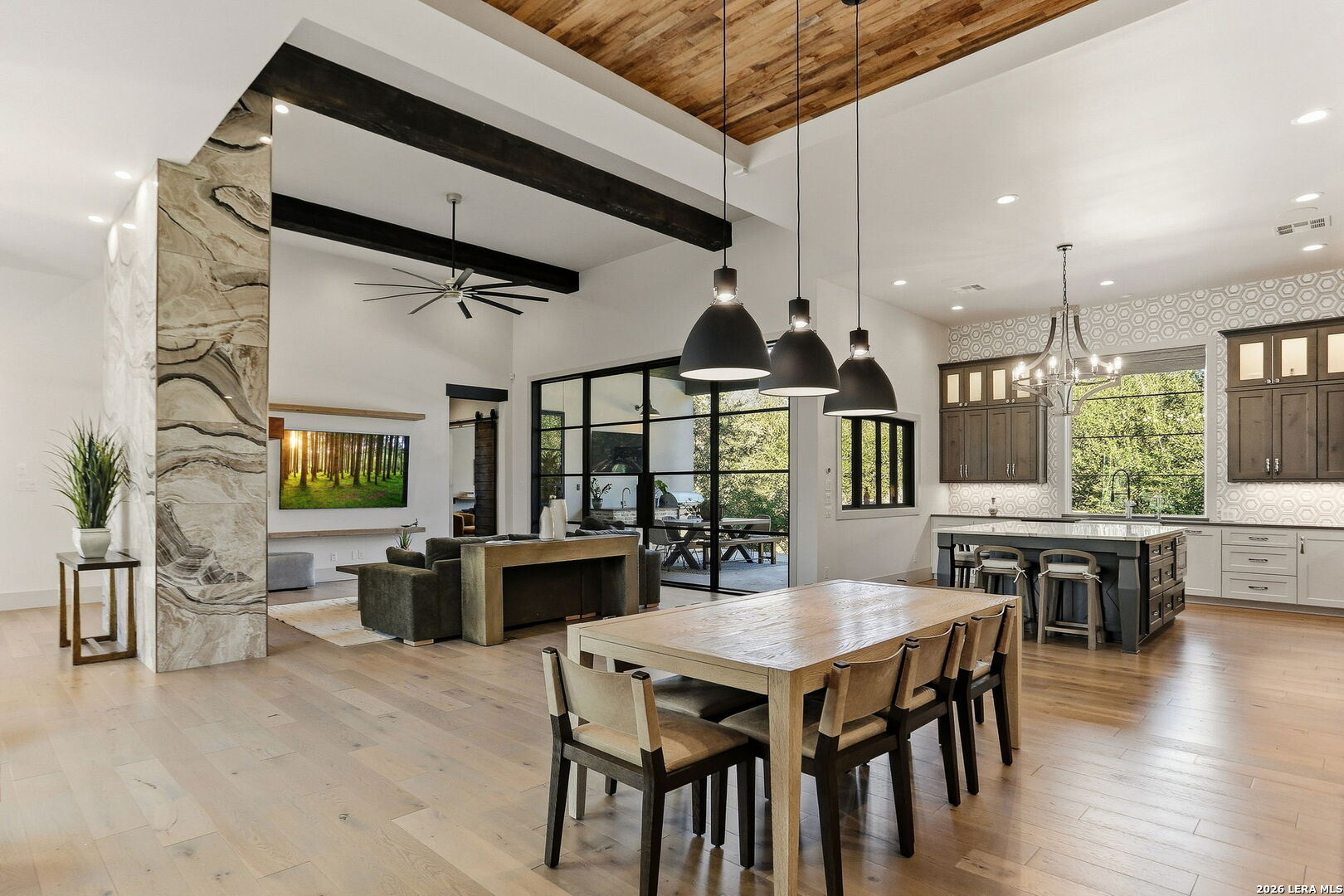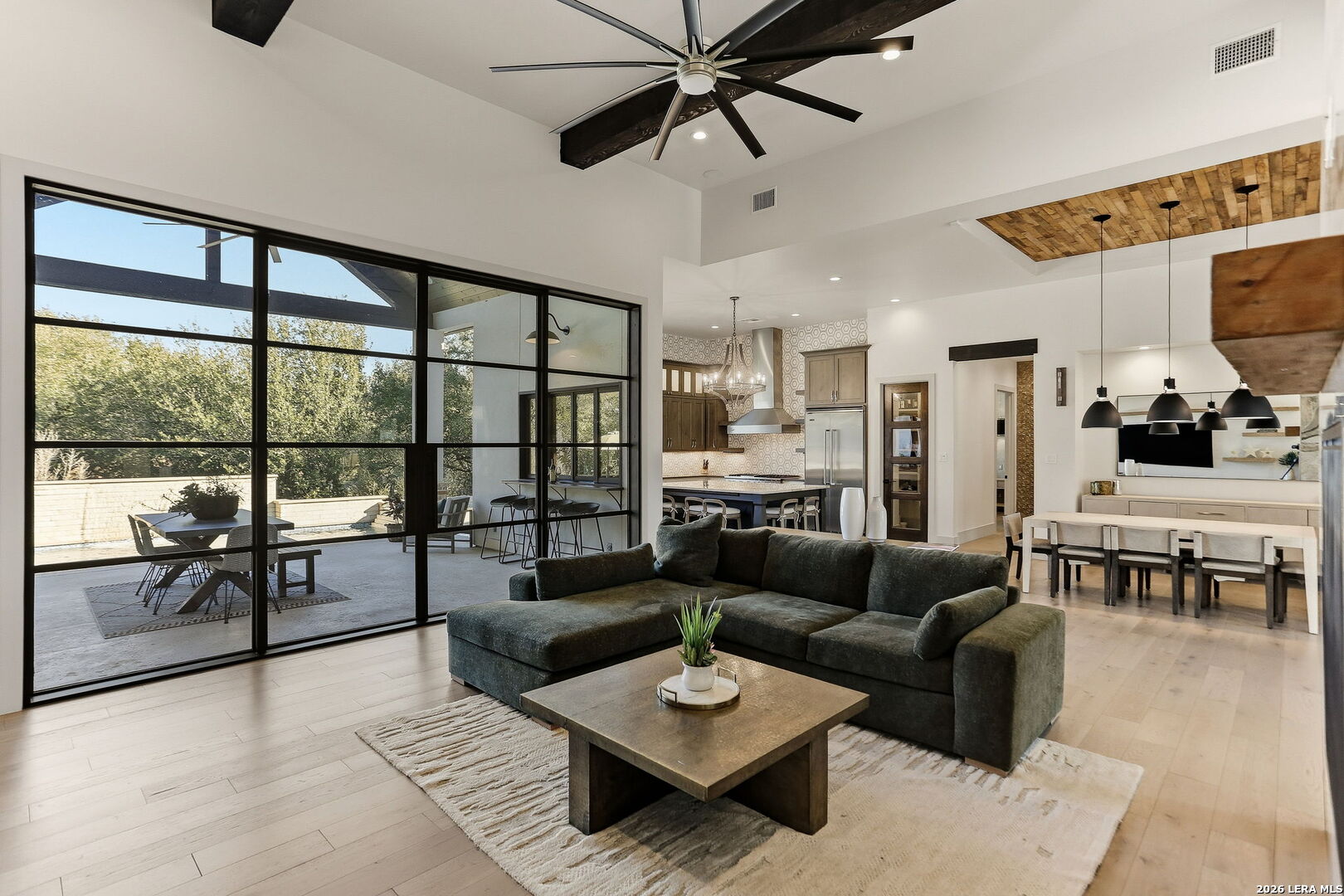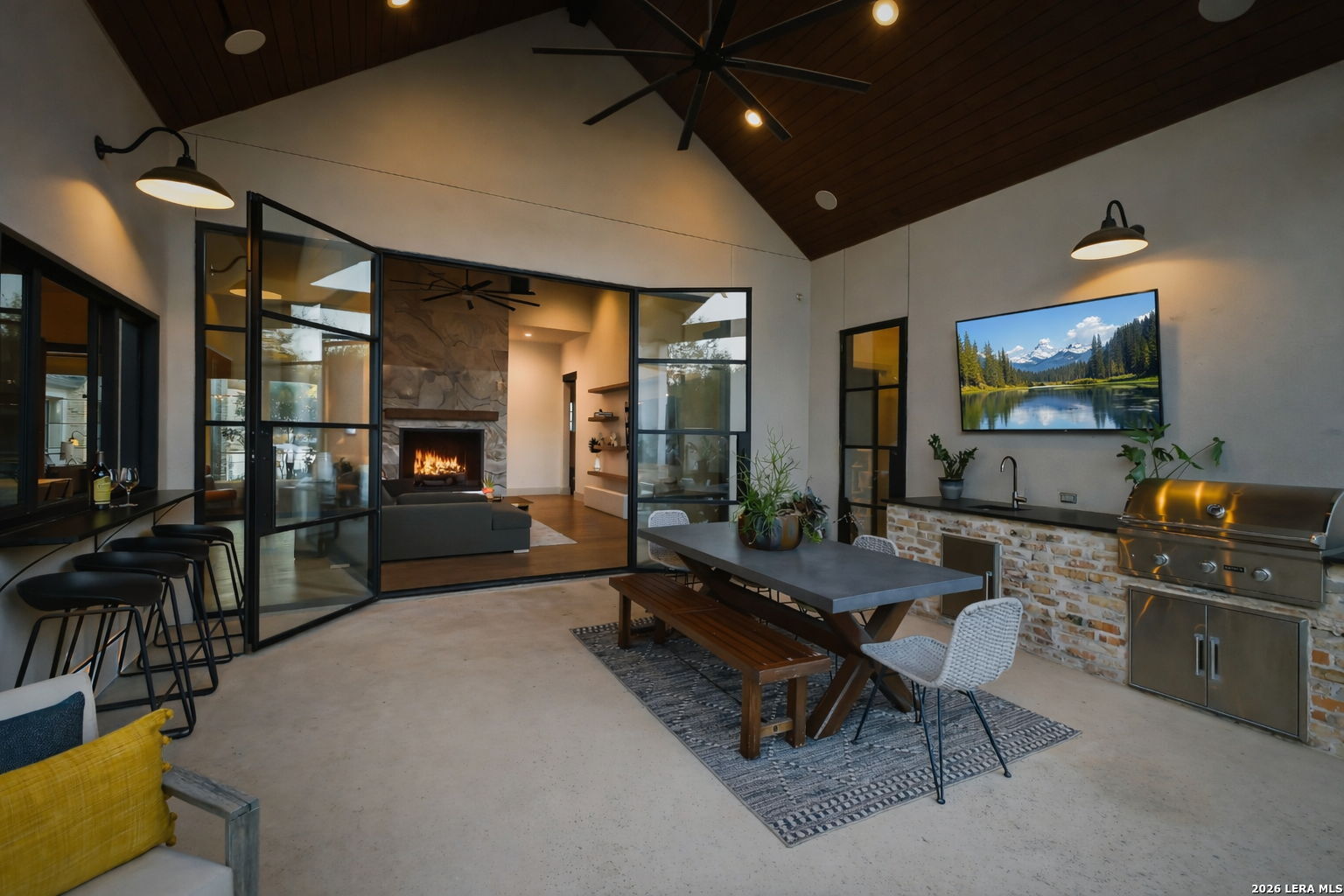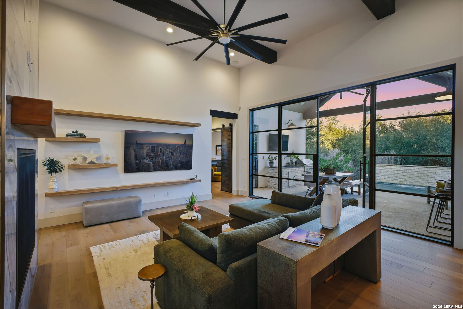 Two Homes. One Estate. Endless Possibilities. Nestled behind the prestigious gates of Cantera Hills, 9719 Midsomer Place presents a rare opportunity to own a private compound where scale, design, and flexibility converge. Set on 1.28 acres, this GSABA Parade of Homes "People's Choice" award-winning estate, built by Casadomaine, features two fully independent luxury residences-thoughtfully designed for multigenerational living, private guest accommodations, or income-producing potential. Spanning over 6,000 square feet of curated living space, both homes showcase bespoke finishes, soaring ceilings with exposed wood beams, and expansive windows that flood the interiors with natural light. Designer lighting, statement fireplaces, and retractable glass doors create a seamless blend of indoor and outdoor living. Each residence is anchored by a chef-inspired kitchen featuring top-tier stainless steel appliances and custom Michael Edwards cabinetry, flowing effortlessly into grand living spaces designed for both elevated entertaining and everyday comfort. The primary living quarters offer a true private retreat experience, complemented by spa-inspired baths and custom-designed closet, while additional suites provide comfort and privacy throughout. A dedicated office, wet bar, fitness space, and pet spa further enhance the home's thoughtful livability. Outdoors, a resort-style setting unfolds with a fully equipped pavilion kitchen, sparkling pool, spa, and cascading water features, creating an atmosphere equally suited for quiet relaxation or refined entertaining. With separate entrances, utilities, and garages for each residence, the estate offers both independence and cohesion within one of San Antonio's most desirable gated communities. Located just minutes from La Cantera, The Rim, and premier dining and shopping, this is a residence that delivers both privacy and proximity. A rare offering designed for those who expect nothing less than exceptional.