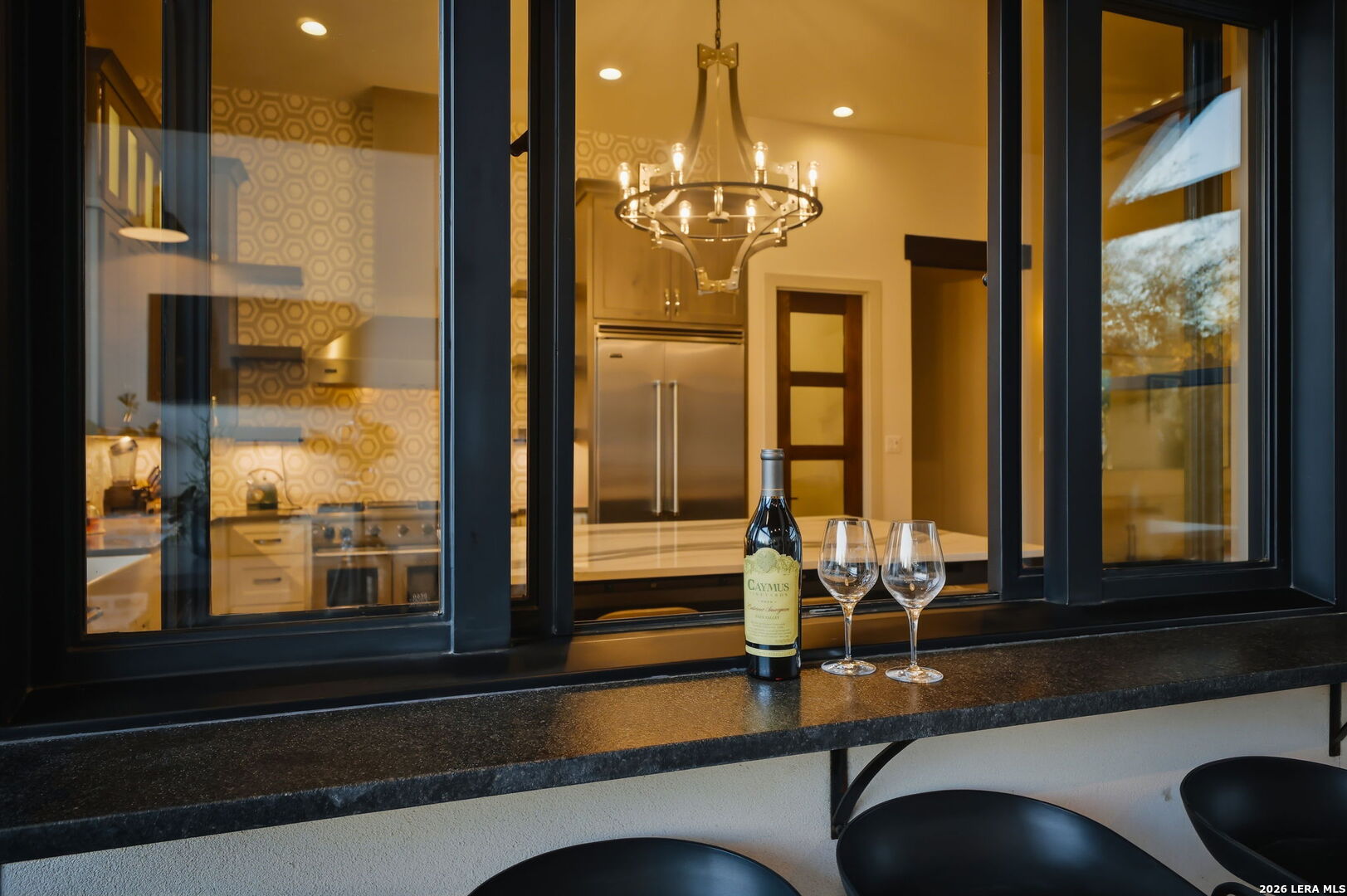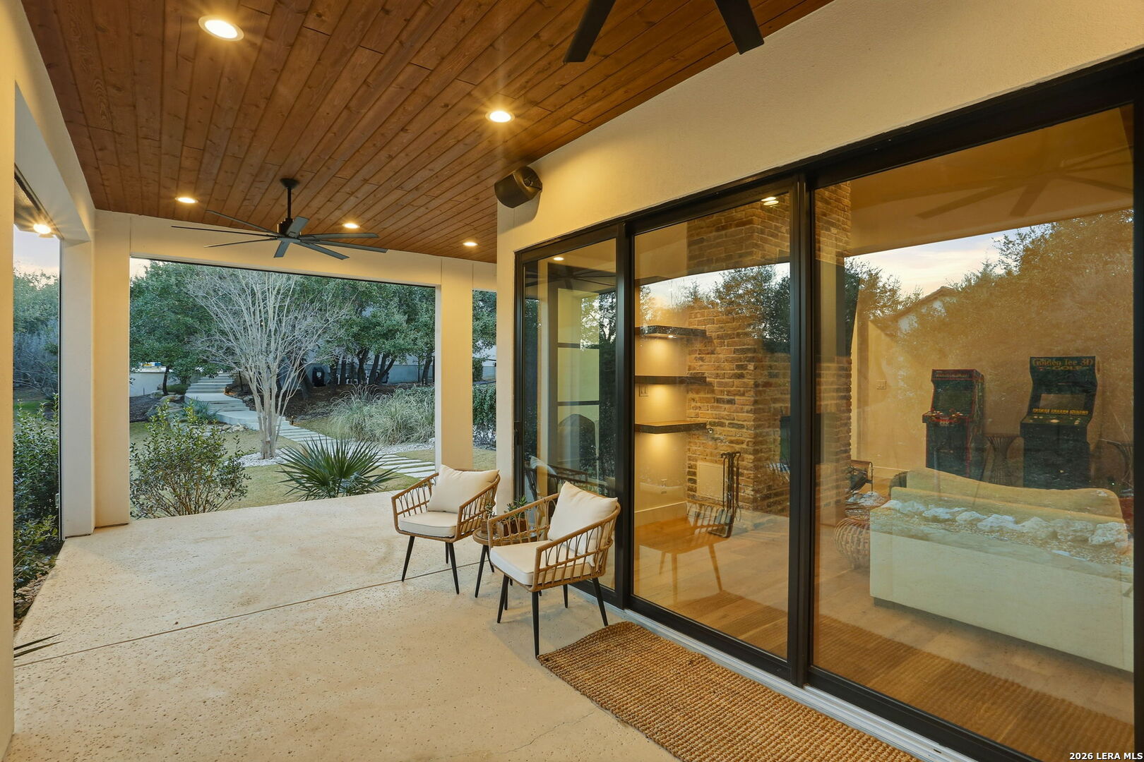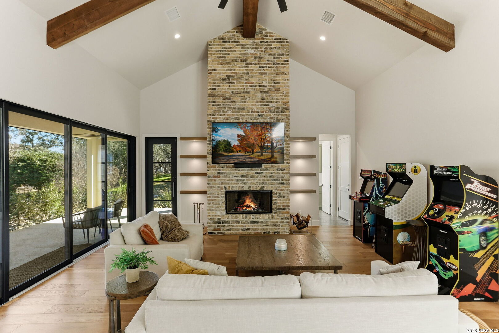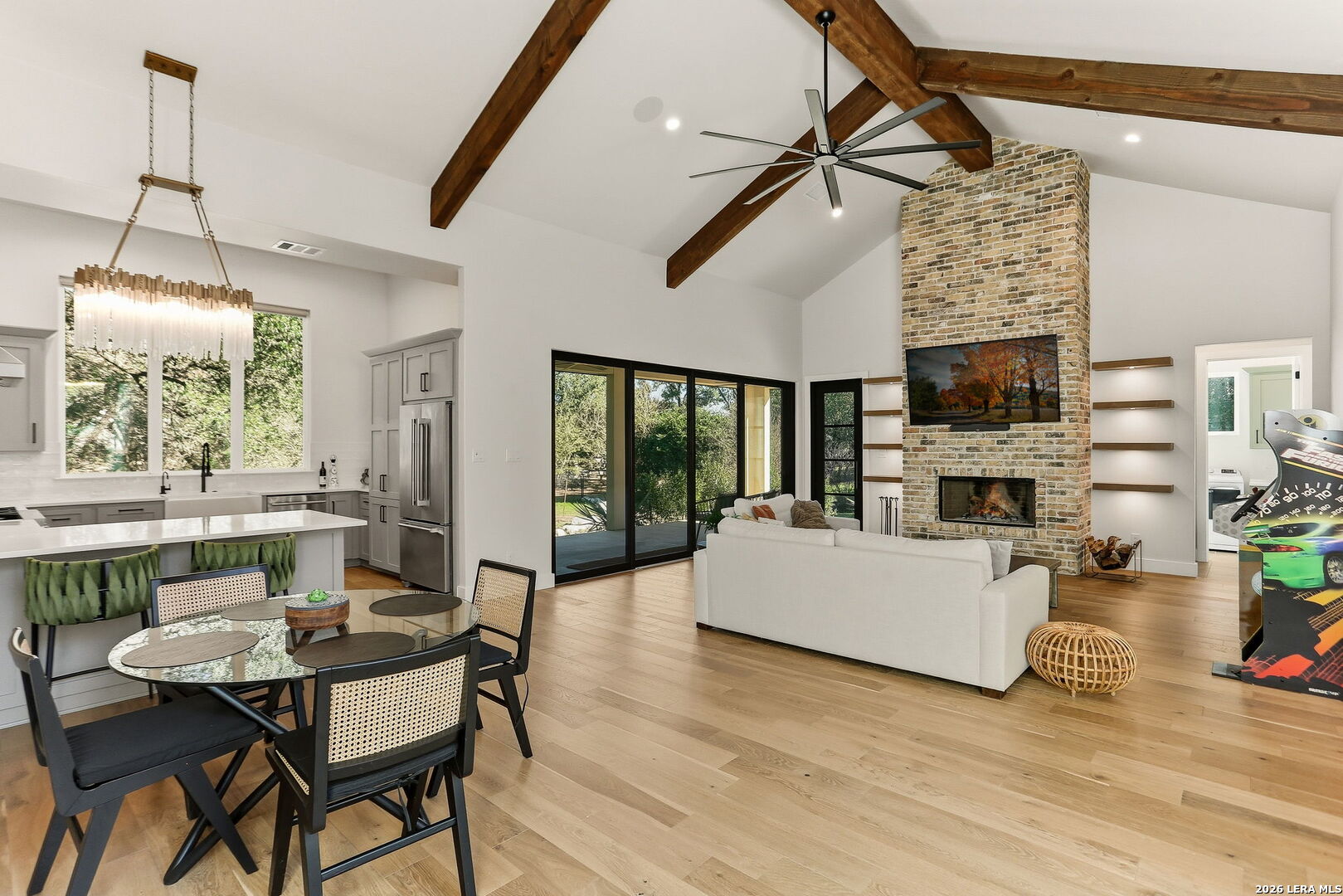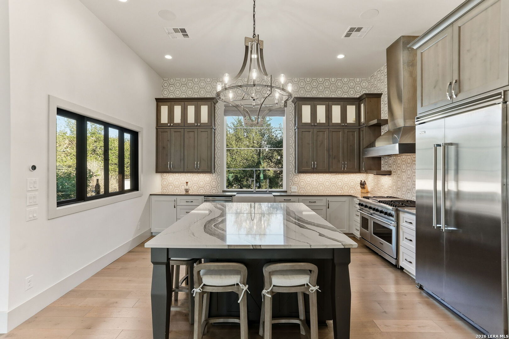 Two Homes. One Estate. Endless Possibilities. Nestled behind the prestigious gates of Cantera Hills, 9719 Midsomer Place presents a rare opportunity to own a private compound where scale, design, and flexibility converge. Set on 1.28 acres, this GSABA Parade of Homes "People's Choice" award-winning estate, built by Casadomaine, features two fully independent luxury residences-thoughtfully designed for multigenerational living, private guest accommodations, or income-producing potential. Spanning over 6,000 square feet of curated living space, both homes showcase bespoke finishes, soaring ceilings with exposed wood beams, and expansive windows that flood the interiors with natural light. Designer lighting, statement fireplaces, and retractable glass doors create a seamless blend of indoor and outdoor living. Each residence is anchored by a chef-inspired kitchen featuring top-tier stainless steel appliances and custom Michael Edwards cabinetry, flowing effortlessly into grand living spaces designed for both elevated entertaining and everyday comfort. The primary living quarters offer a true private retreat experience, complemented by spa-inspired baths and custom-designed closet, while additional suites provide comfort and privacy throughout. A dedicated office, wet bar, fitness space, and pet spa further enhance the home's thoughtful livability. Outdoors, a resort-style setting unfolds with a fully equipped pavilion kitchen, sparkling pool, spa, and cascading water features, creating an atmosphere equally suited for quiet relaxation or refined entertaining. With separate entrances, utilities, and garages for each residence, the estate offers both independence and cohesion within one of San Antonio's most desirable gated communities. Located just minutes from La Cantera, The Rim, and premier dining and shopping, this is a residence that delivers both privacy and proximity. A rare offering designed for those who expect nothing less than exceptional.