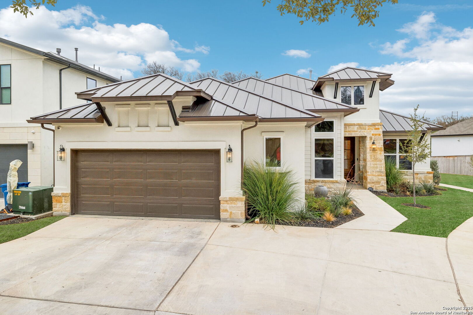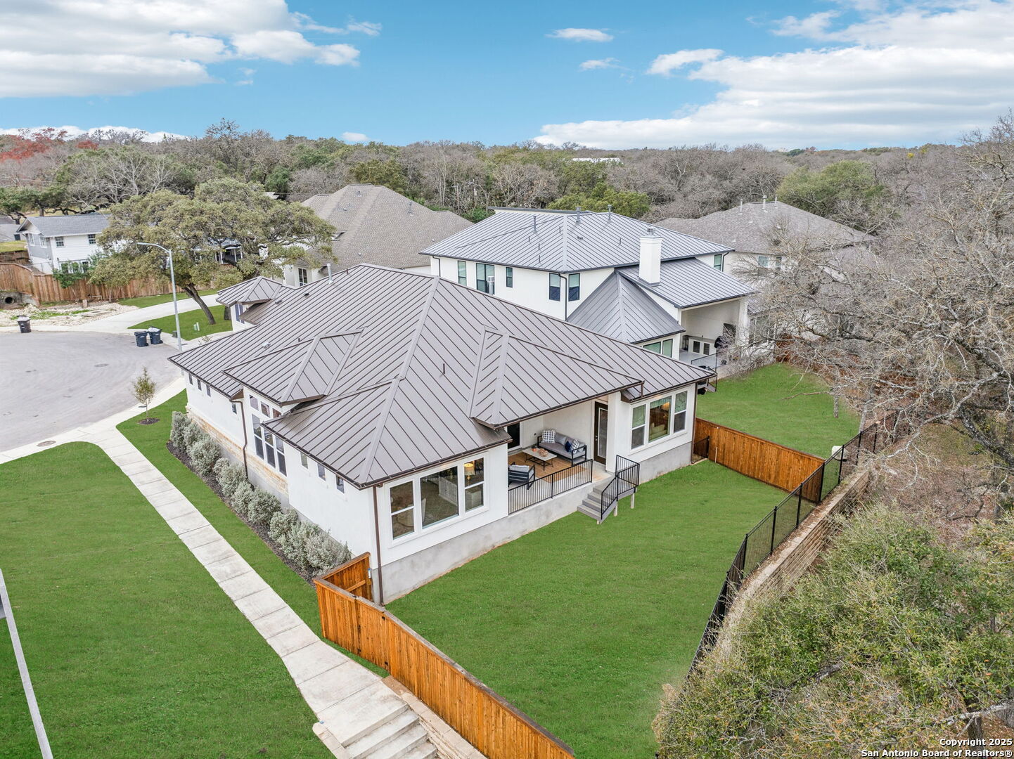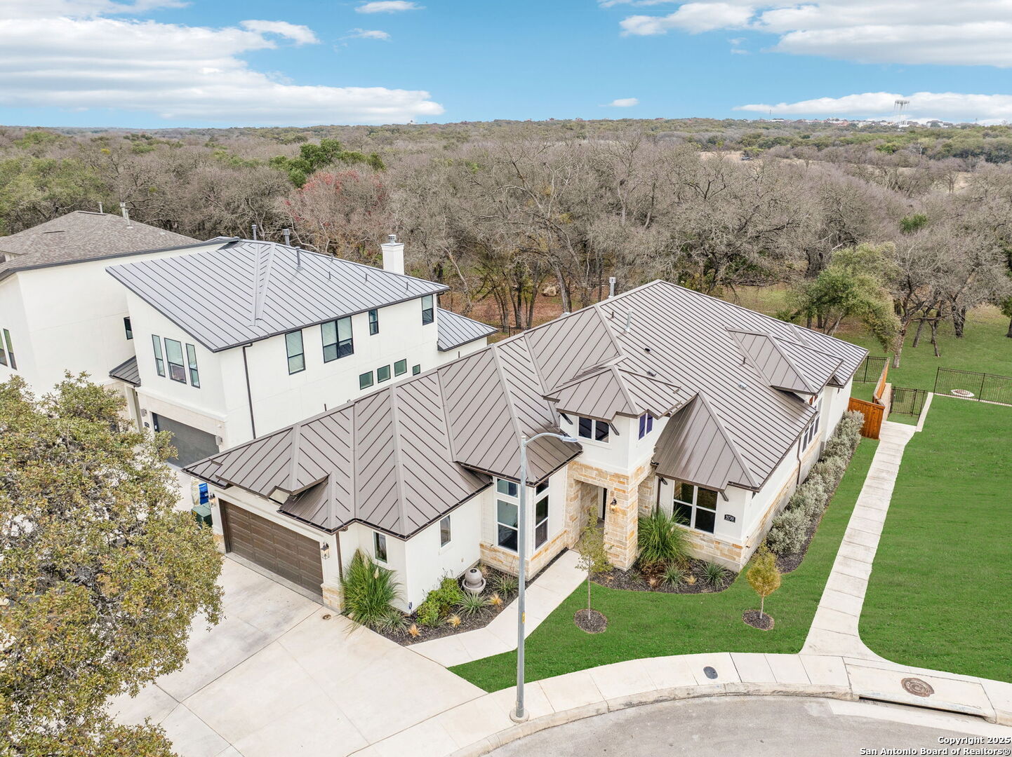 There's a comfortable sophistication to this gorgeous 2023 North Central home on a quiet cul-de-sac off Vance Jackson near Callaghan. This +/- 3035 square foot, one-story, 3-bedroom, 3-and-a-half bath contemporary stunner sits on close to 0.20 acres in a newer, secluded neighborhood. Inside, you'll find an impressive interior boasting high ceilings, large rooms, wood, marble and tile flooring with a tasteful color palette that ties this modern family home together. The entry leads you past a well-appointed office/study space on the way to its designer kitchen with top-of-the-line Bosch and JennAir appliances with walk-in pantry and island that seamlessly shares space with the home's open dining and family rooms with built-ins, gas fireplace and sliding glass doors that open to the covered patio. Adjacent to this great room is the home's private living room. Across from it, you'll find the primary suite retreat with private access to the patio and large bath featuring dual vanities, a free-standing tub and separate shower and his and hers closets. Down the hall, there are two ample secondary bedrooms, each with their own en-suite baths. The expansive, covered patio boasts a full outdoor kitchen with Coyote appliances and comfortable conversation area, overlooking the home's tidy yard and greenbelt that backs up to the house. In immaculate condition, this modern home also has custom cabinets, storage and blinds throughout, designer touches, indoor utility and mud room areas, a two-car, attached garage and metal roof.