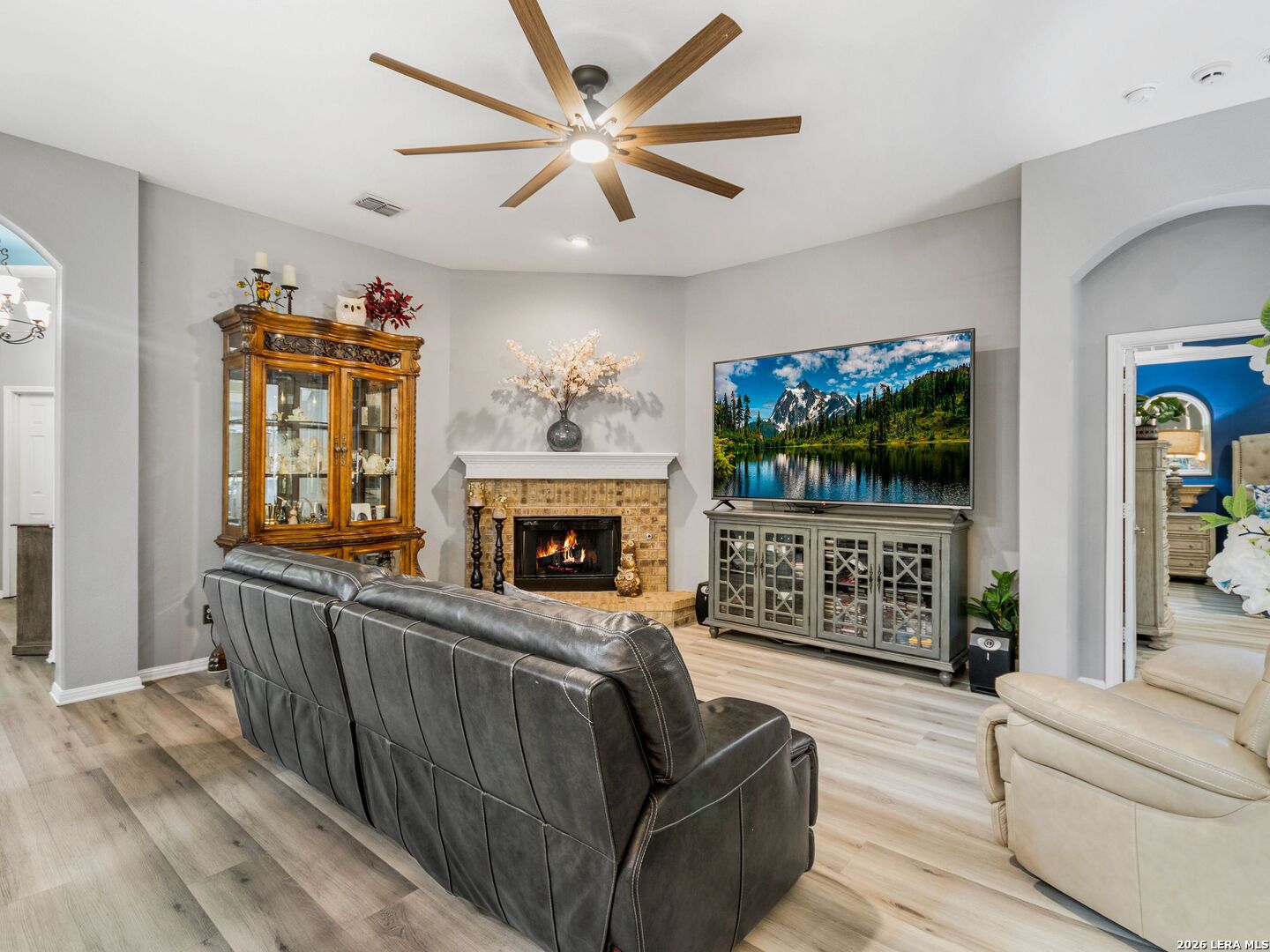 Beautiful single-story home on a tree-studded corner cul-de-sac lot in a gated community. Features high ceilings, art niches, window seats, and a fireplace with a mantle and raised hearth. The kitchen includes Silestone counters, stainless steel appliances, gas cooking, a breakfast bar, and a walk-in pantry. The primary suite offers a tray ceiling and upgraded tiled shower/tub surrounds. Additional highlights: Updated secondary bathroom, water softener, covered and extended patio, 3-car garage with utility sink and suspended storage, plus storage shed. Access to Hwy 1604 and Hwy 151 nearby, Shopping, Alamo Ranch, Dove Creek, and La Cantera.
