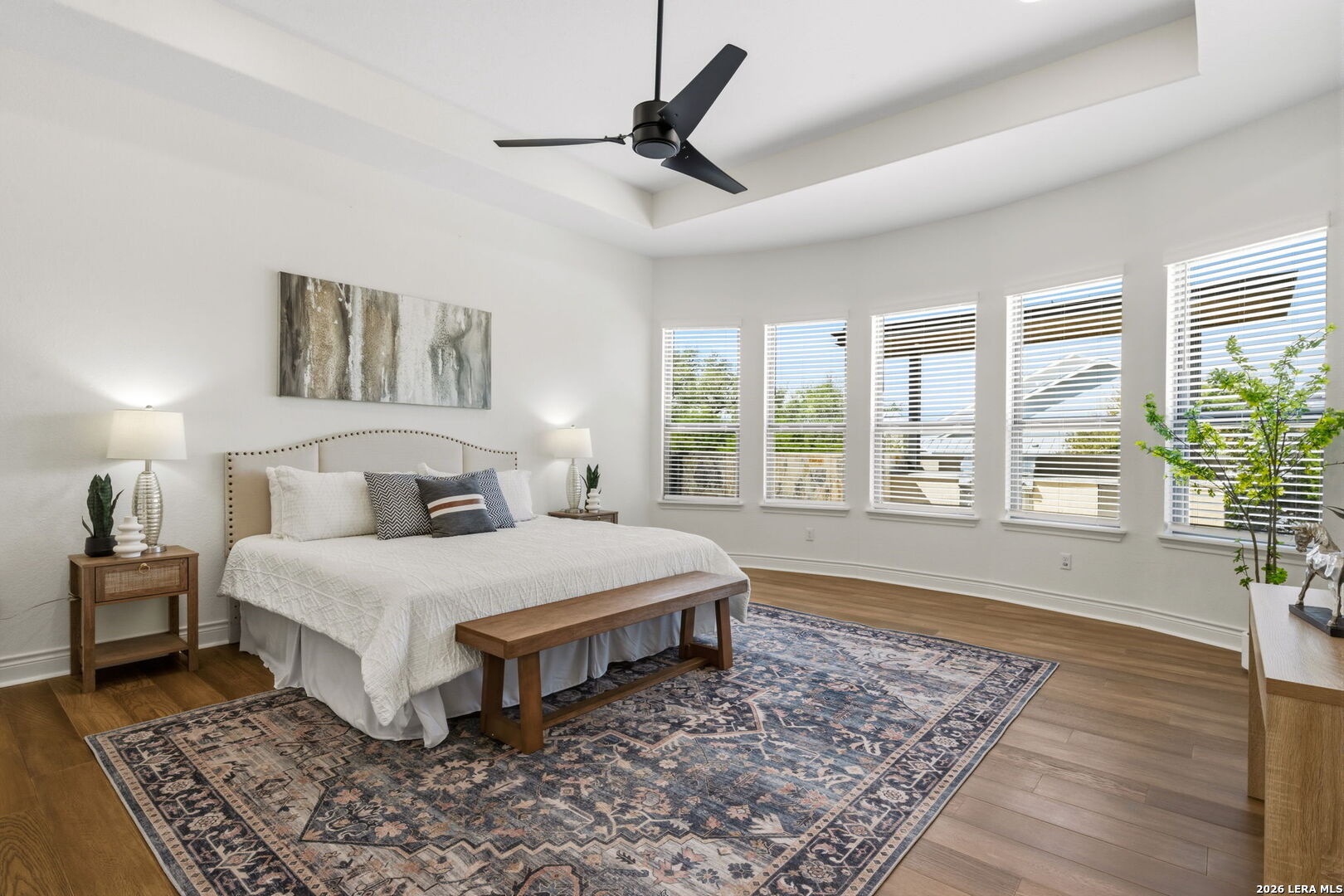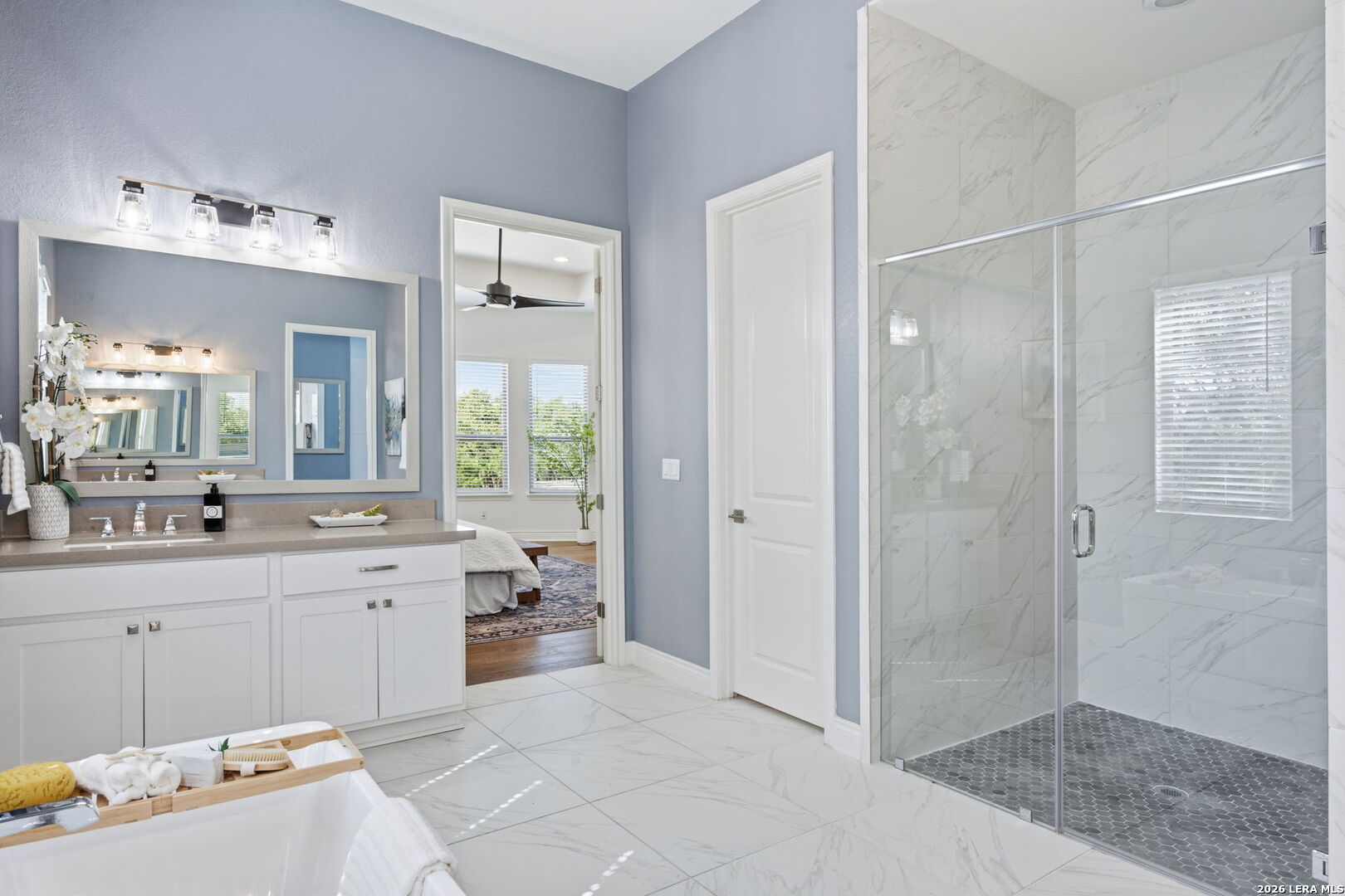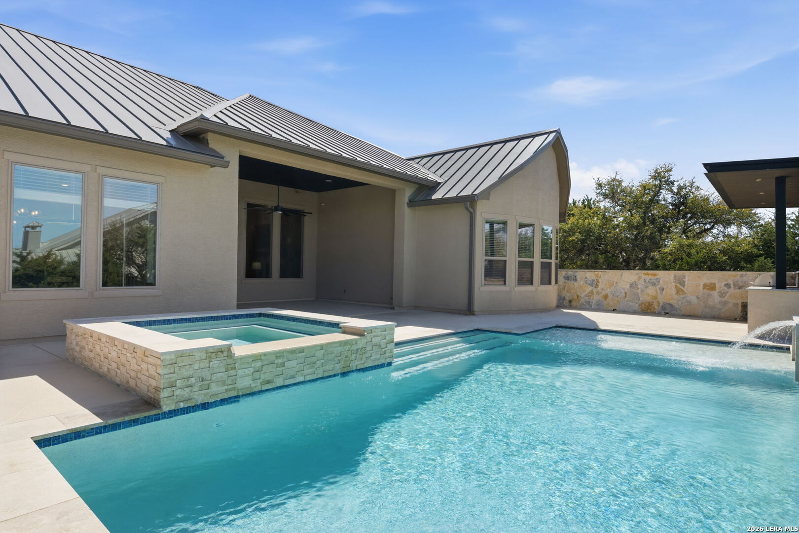 Experience elevated living in this stunning luxury home located in the highly sought-after gated community of Belle Oaks. Designed with both elegance and functionality in mind, this residence features an open-concept floor plan enhanced by expansive picture windows that fill the home with natural light and seamlessly connect indoor and outdoor living. Offering 4 spacious bedrooms and 4.5 baths, every bedroom includes its own private ensuite bath and walk-in closet, providing ultimate comfort and privacy. The primary suite is a true retreat, complete with a spa-inspired bath featuring a soaking tub, oversized walk-in shower, dual vanities, and a custom-designed walk-in closet that blends style with efficiency. The thoughtfully designed layout includes a private office, a game room, and a media room-perfect for both work and play. The chef's kitchen is equipped with double ovens, a walk-in pantry, and a butler's pantry, making it ideal for entertaining and everyday living. A spacious 3-car garage showcases beautiful epoxy floors, combining durability with a clean, high-end finish. Step outside to your private backyard oasis featuring a resort-style pool and spa, along with a spacious sundeck perfect for relaxing or entertaining. Belle Oaks offers a peaceful, upscale lifestyle with exceptional community amenities including a pool, clubhouse, sports courts, playground, scenic walking trails, and a serene community pond-perfect for enjoying the beauty of the Texas Hill Country. This home truly combines luxury, comfort, and lifestyle in one exceptional setting.