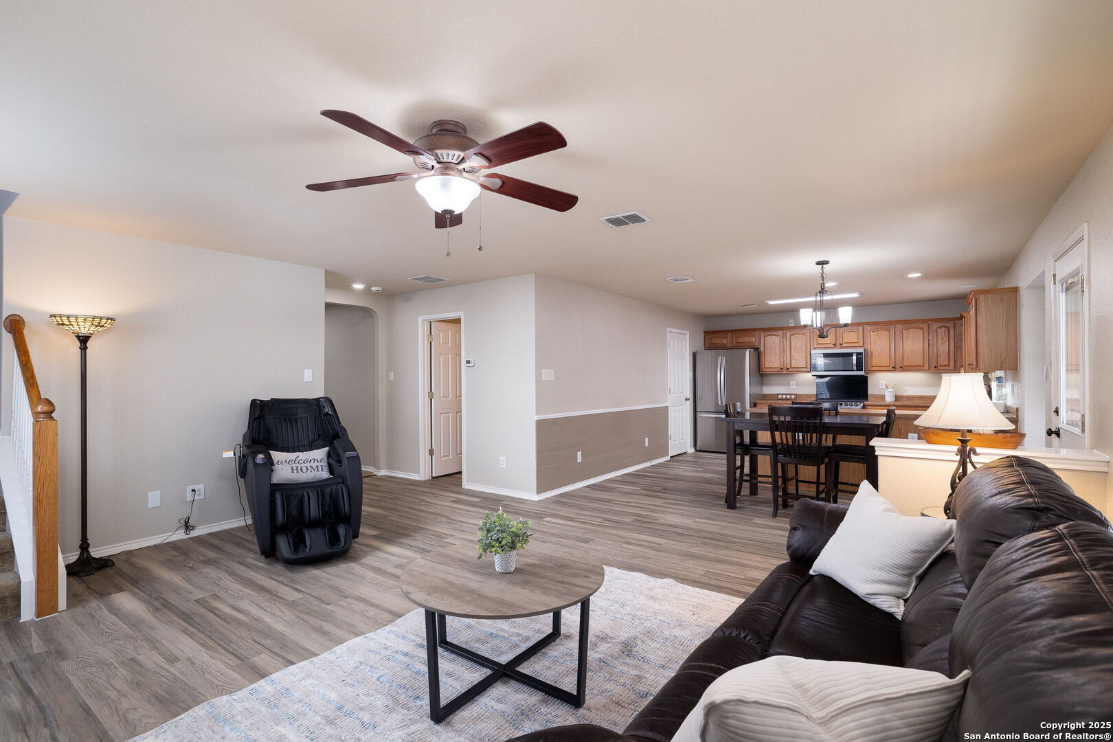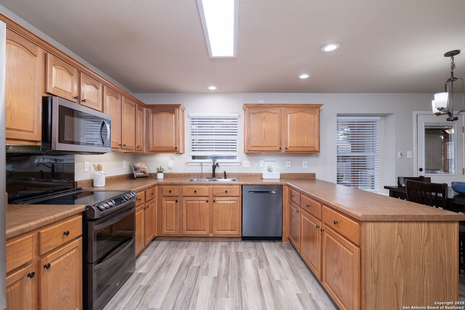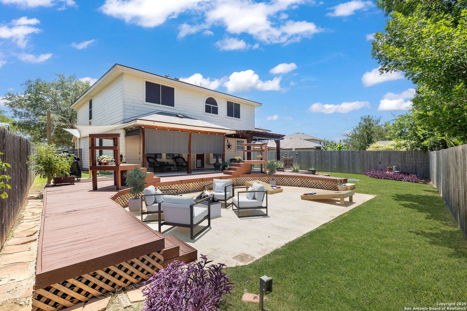 Welcome to this beautifully maintained home nestled on a quiet cul-de-sac in the sought-after Wildhorse community. With great curb appeal, new sod in the front yard, mature trees, and solar screens for energy efficiency, this two-story gem offers a flexible layout and thoughtful updates throughout. Step inside to find fresh neutral paint, updated lighting, and new versatile vinyl plank flooring. Just off the entry, a front room provides the perfect space for formal dining, a playroom, or a home office. The open-concept living area flows seamlessly into a spacious eat-in kitchen equipped with stainless steel appliances, a double oven (range installed 01/2019), ample cabinetry, and generous counter space, ideal for entertaining or everyday meals. Upstairs, the oversized primary suite features a walk-in shower, soaking tub, and dual vanity. A large loft offers additional living space, great for a media room, game room, or remote work area, and two secondary bedrooms and a full bath located upstairs for added privacy. Step outside to your private backyard retreat with an extended covered patio, pergola, and plenty of room for a pool or garden, perfect for weekend BBQs or quiet evenings under the stars. HOME HIGHLIGHTS: Roof (installed 06/2020), HVAC system with UV sterilizer, Radiant Barrier Roof Decking, Custom garage with built-in storage, Commercial sink, and Barn-door closet, Water softener system (installed 02/2019), Reverse osmosis filter, and Solar screens for energy efficiency. Wildhorse offers resort-style amenities including 2 pools, BBQ grills, basketball court, dog park, 2 playgrounds, a covered pavilion, walking/jogging trails, and is walking distance to the elementary school and daycare center. Just minutes from Helotes, Loop 1604, HWY 151, Lackland AFB, a ton of shopping, and dining! With style, space, and an unbeatable location-this home is ready to impress. Schedule your showing today!