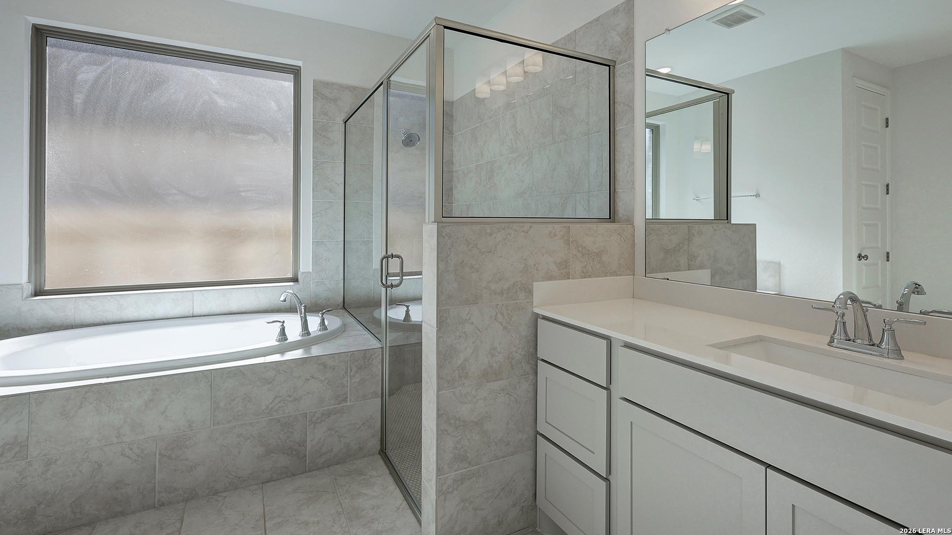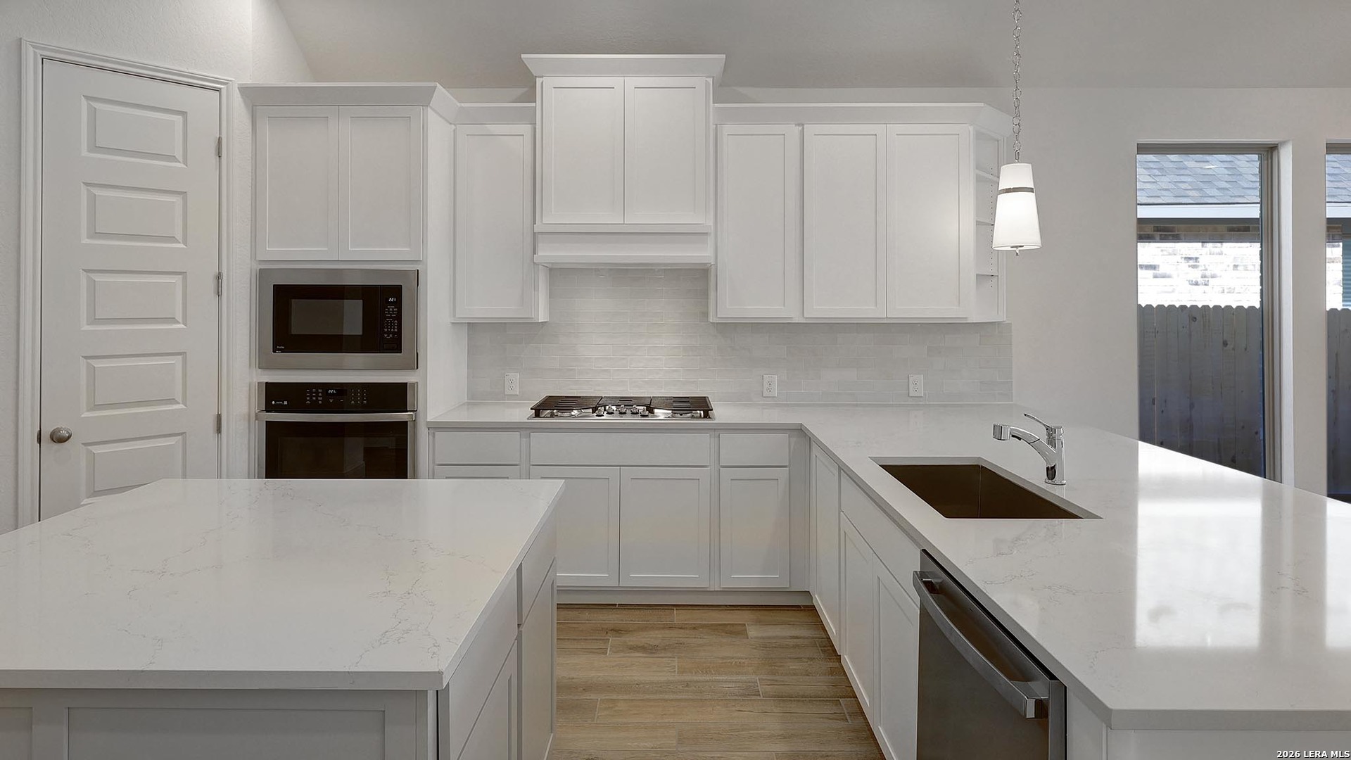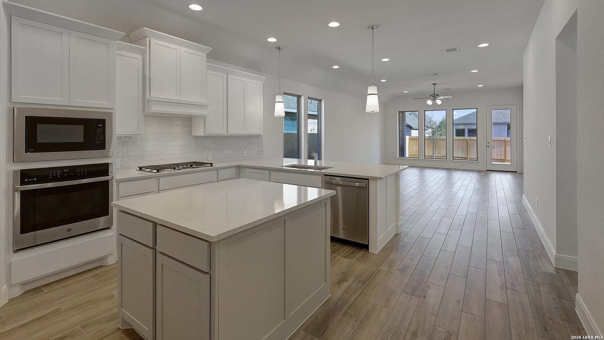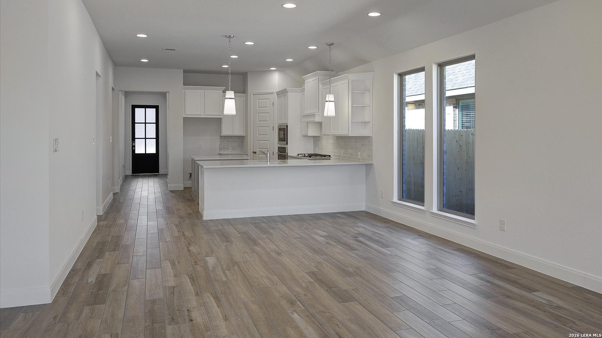 Home office with French doors set at entry with 11-foot ceiling. Open kitchen offers center island, 5-burner gas cooktop and corner walk-in pantry. Dining area opens to spacious family room with wall of windows. Private primary suite includes bedroom with wall of windows. Dual vanity, corner garden tub, separate glass-enclosed shower and large walk-in closet in primary bath. Abundant closet space and natural light throughout. Covered backyard patio, 5-zone sprinkler system and mud room off two-car garage.