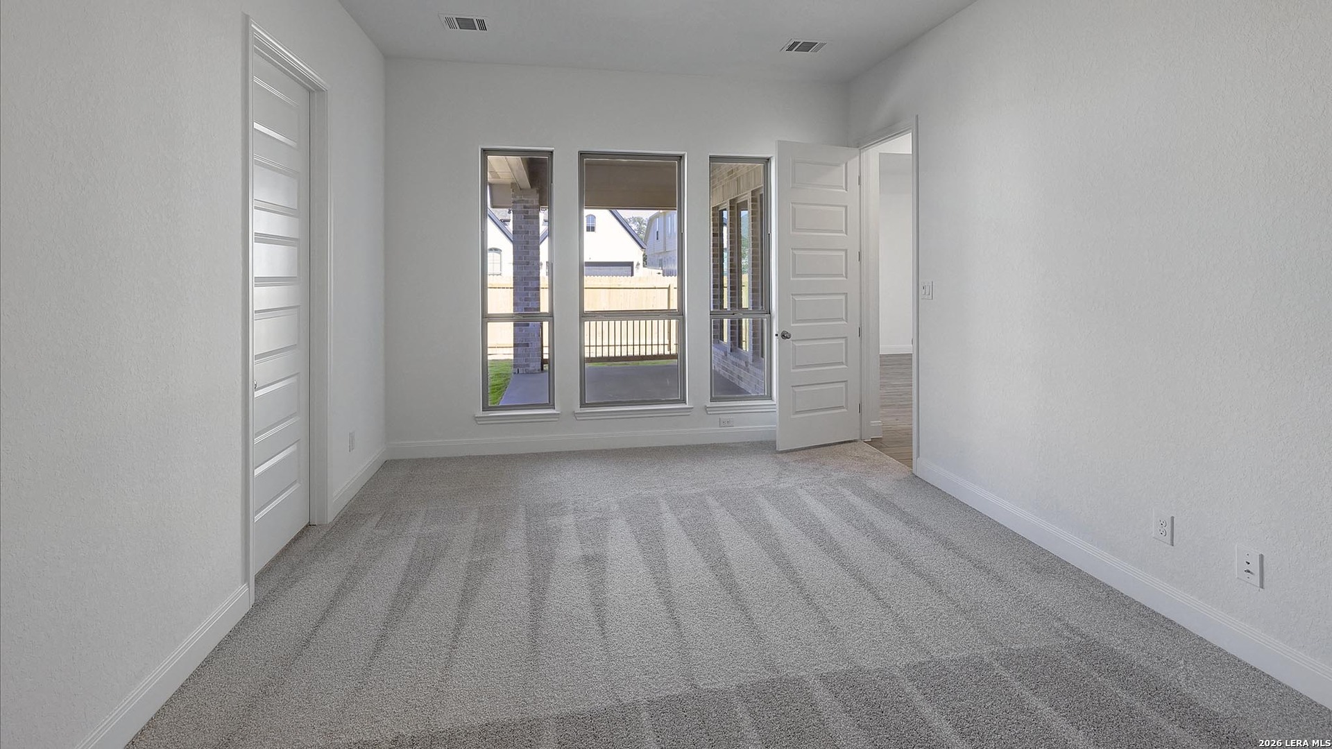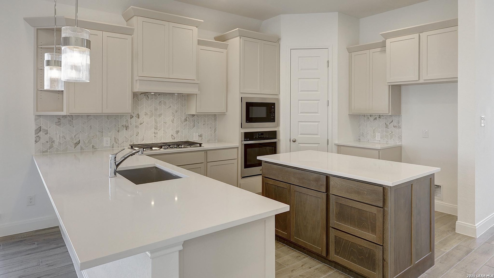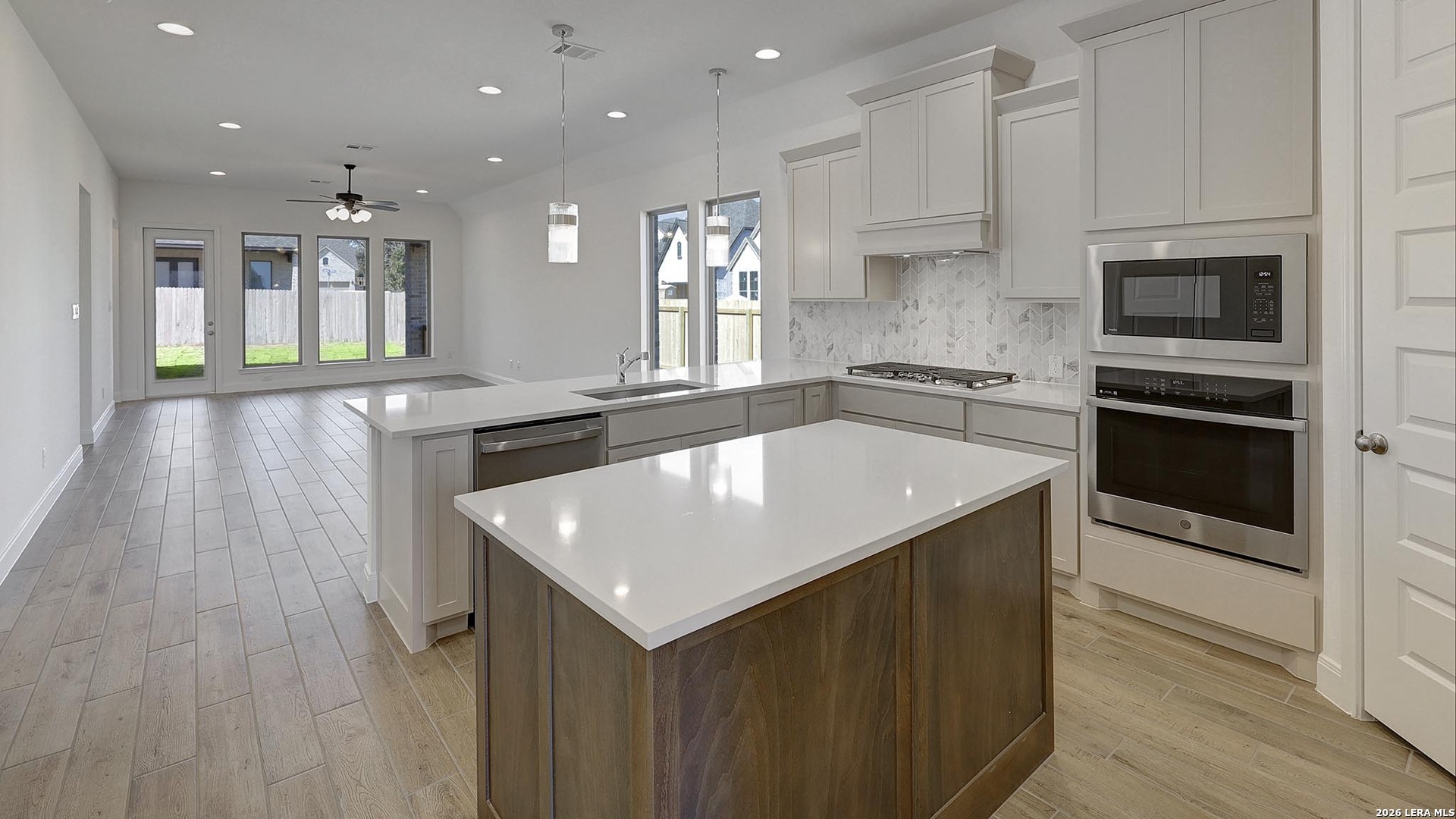 Home office set at entry. Open island kitchen offers a 5-burner gas cooktop, walk-in pantry and generous counter space. Dining area flows to open family room with wall of windows. Primary suite includes primary bath with dual vanity, garden tub, separate glass-enclosed shower and walk-in closet. Secondary bedrooms with walk-in closets, a full bathroom with dual sinks and a utility room completes this design. Covered backyard patio, 5-zone sprinkler system, two-car garage.