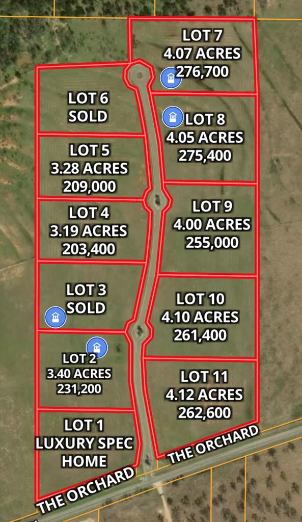 Welcome home to the gated community, The Orchard! Located less than 3 miles from Fredericksburg and set across 44 beautiful acres, The Orchard offers 11 exclusive homesites ranging from 3 to 4 acres. Enjoy the convenience of paved roads with curbs, landscaped medians, underground utilities, and fiber optic internet. Lots 2, 7 & 8 already have wells in place. Reasonable restrictions allow you to choose your own builder, with a minimum of 2,000sf required for a primary residence. Each property also permits one guest house (500–1,000sf) that must match the exterior material of the main home. The HOA maintains the roads, controlled entry with camera access, and landscaping. A discount is available on the lot price with a signed construction contract with GT Builders to build your custom home.