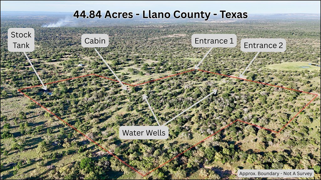 44.84 Acres in Llano County, Texas. Available now! Have you been dreaming of a Hill Country getaway to escape the daily grind? Perhaps you're looking for a picture-perfect place to build your forever home. This 44.84-acre property features rolling hills, gorgeous mature Oak and Elm trees, and stunning long-distance views in almost every direction. An earthen stock tank and a wet-weather creek add both beauty and character to the land, while numerous draws and thick native cover provide an exceptional habitat for local wildlife and hunting. For a comfortable retreat, the property includes a charming 288-square-foot cabin, perfect for resting after a day outdoors. It comes equipped with air conditioning, a full kitchen, a full bathroom, and a quaint country front porch with "views for days." The land is fully fenced with multiple entrances, and it has already been pre-divided into approximately five-acre tracts, offering excellent future investment flexibility. With electric, multiple water wells on-site and an active agricultural exemption for low taxes, this property is as practical as it is beautiful. Located on a paved county road approximately 25 minutes northwest of Llano and 90 minutes from both Austin and San Antonio, this versatile land is ideal as a recreational retreat, a hunting spot, or the site of your future dream home. This just might be the perfect place for you!
